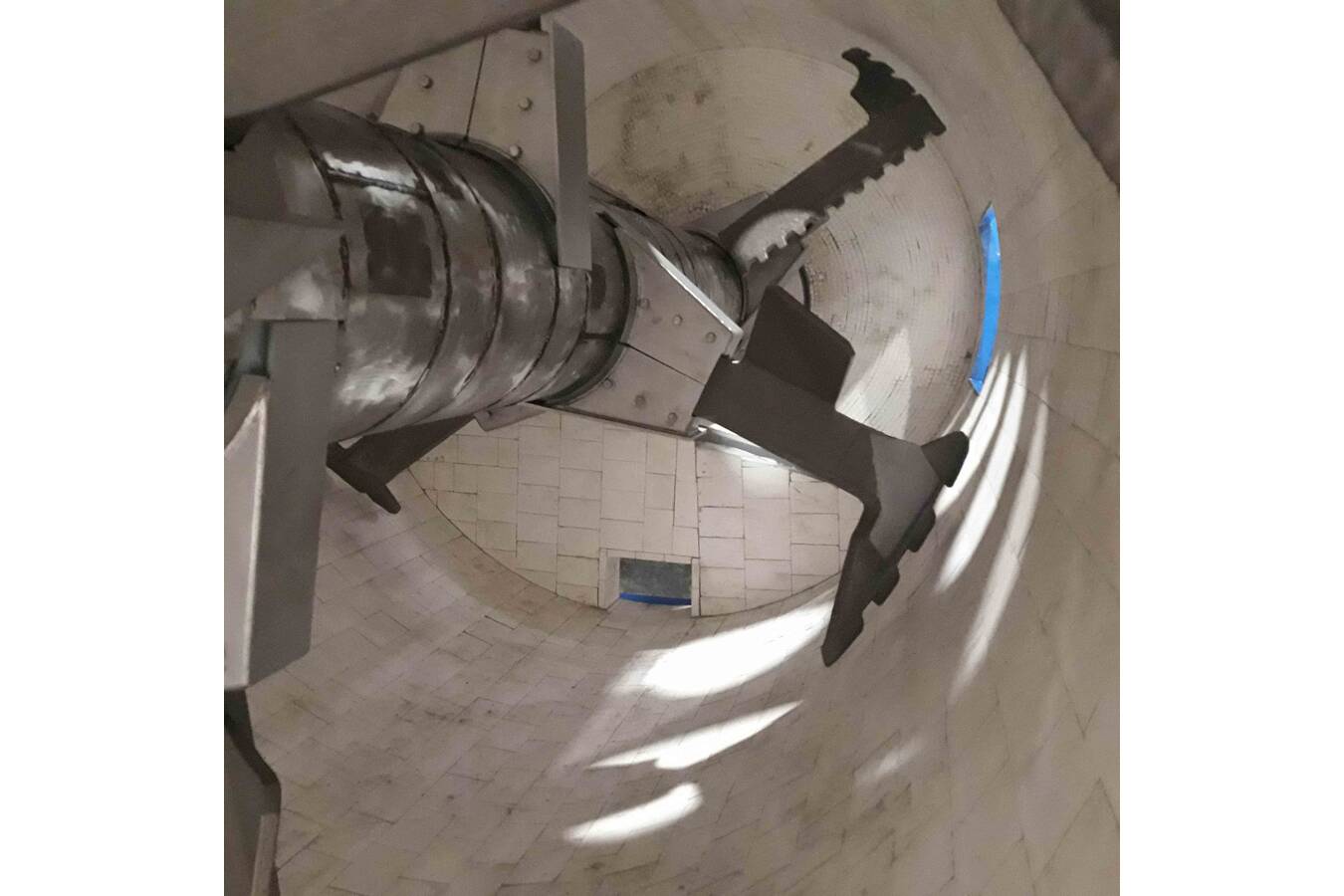 Als weiterer Verschleißschutz ist die Mischwerkswelle mit einem Schleißblech aus Duplex-Stahl (1.4462) verkleidet. Als zusätzliche Maßnahme wurde der innere Bereich der Trommel komplett mit einer starken Aluminiumoxid-Keramikauskleidung ausgerüstet.