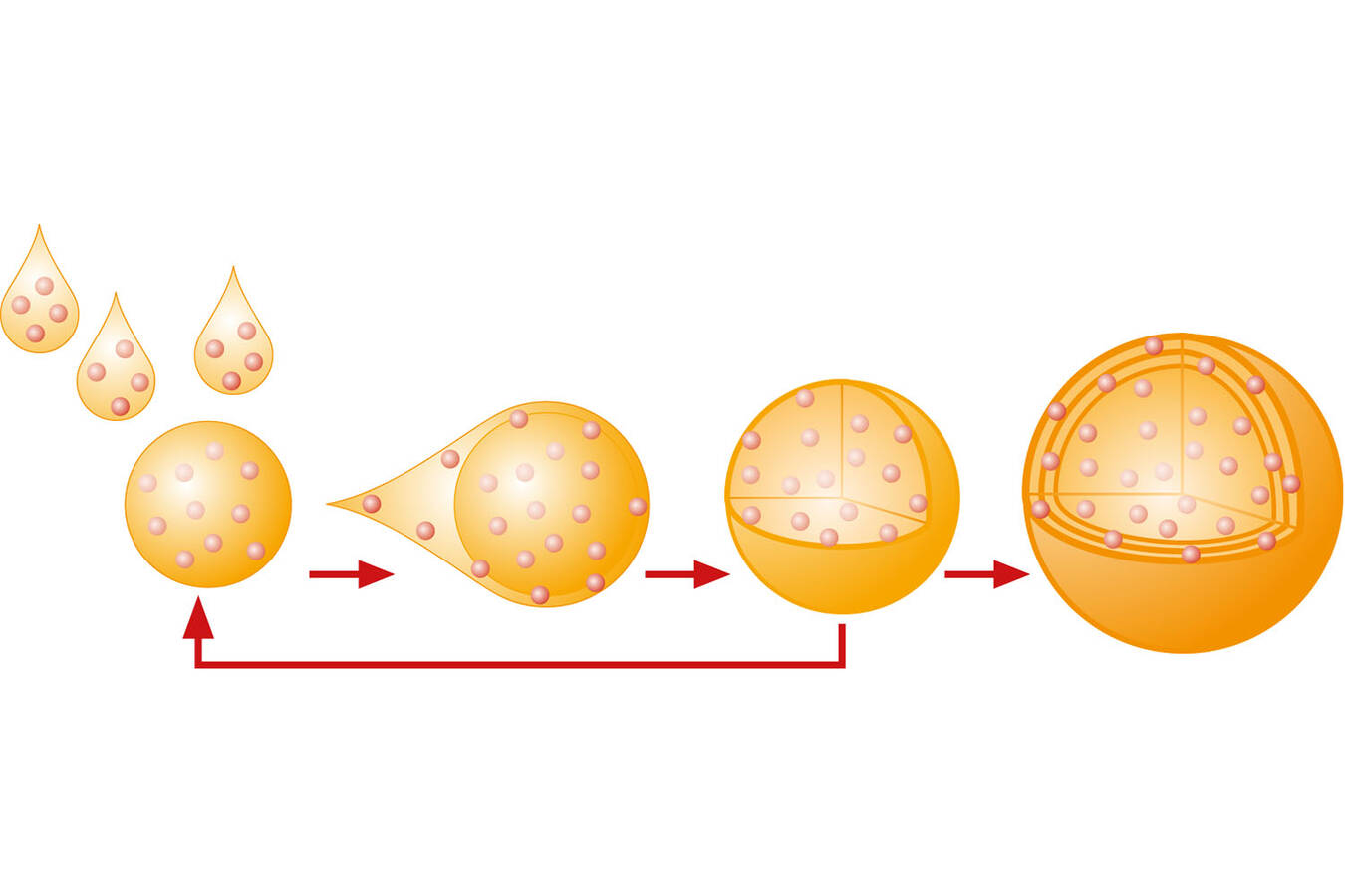 Der Prozess der Mikroverkapselung verbindet das Einschließen hydrophober Stoffe in eine Matrix mit der Granulatbildung und Trocknung.