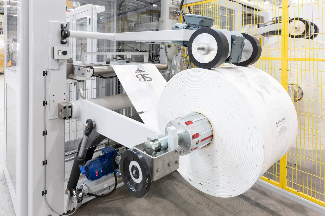 - Die Flachfolie wird über eine Formschulter gezogen, die mit einer reibungsarmen Beschichtung versehen ist, und zu einem Schlauch geformt.