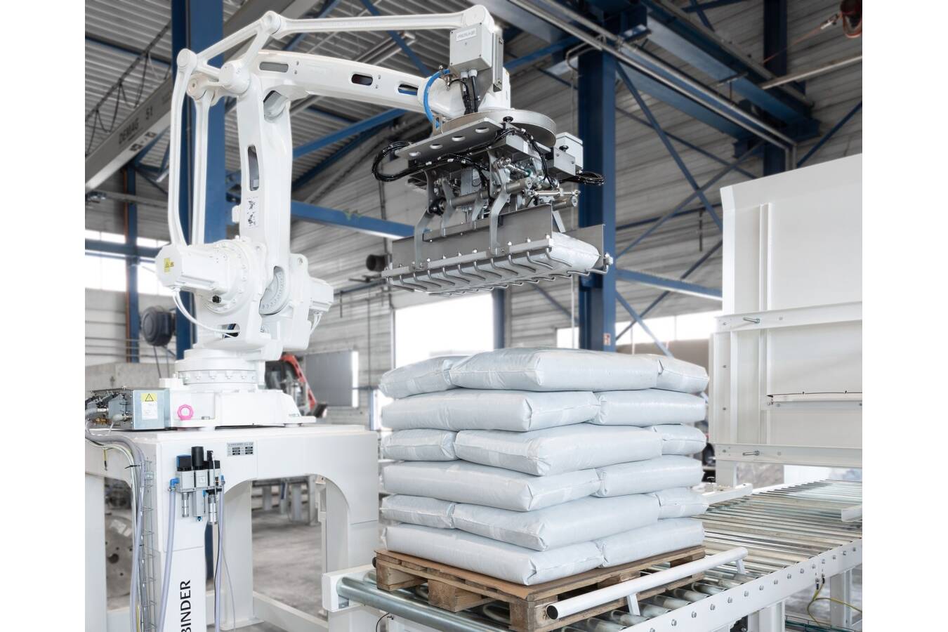 - Der Sack wird dann über ein Förderband zu einem Palettierer transportiert.