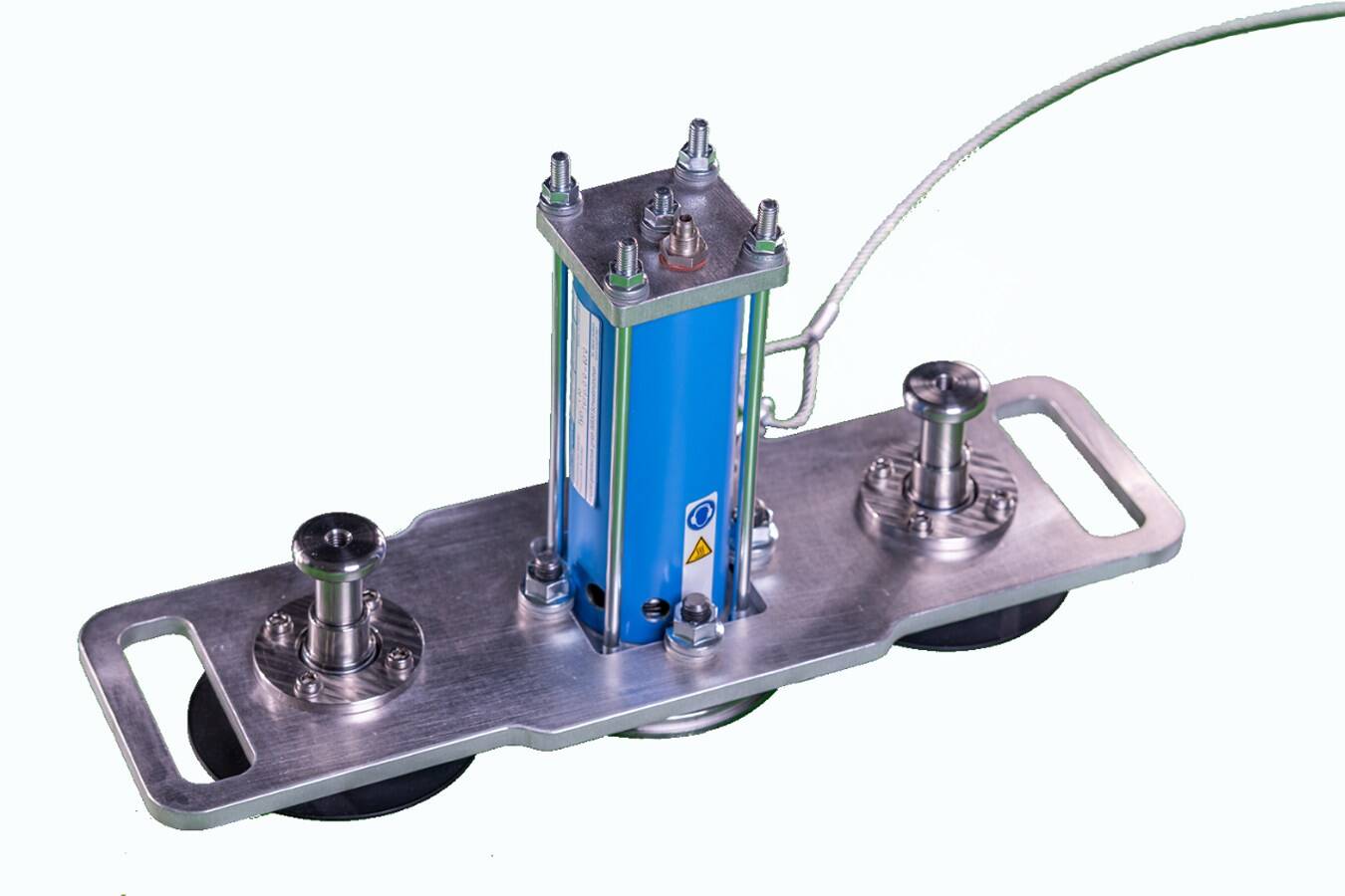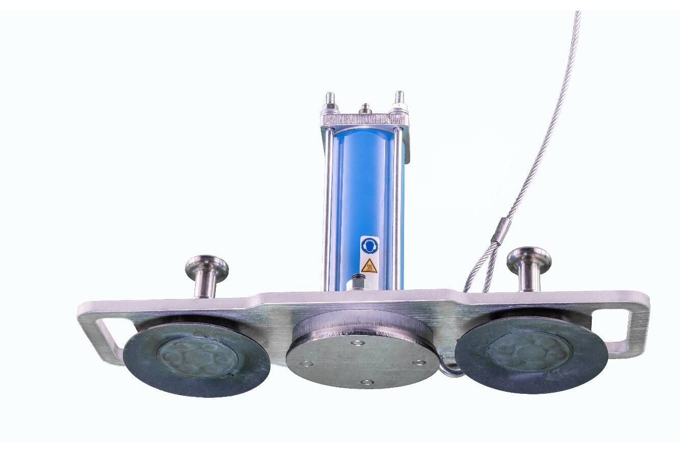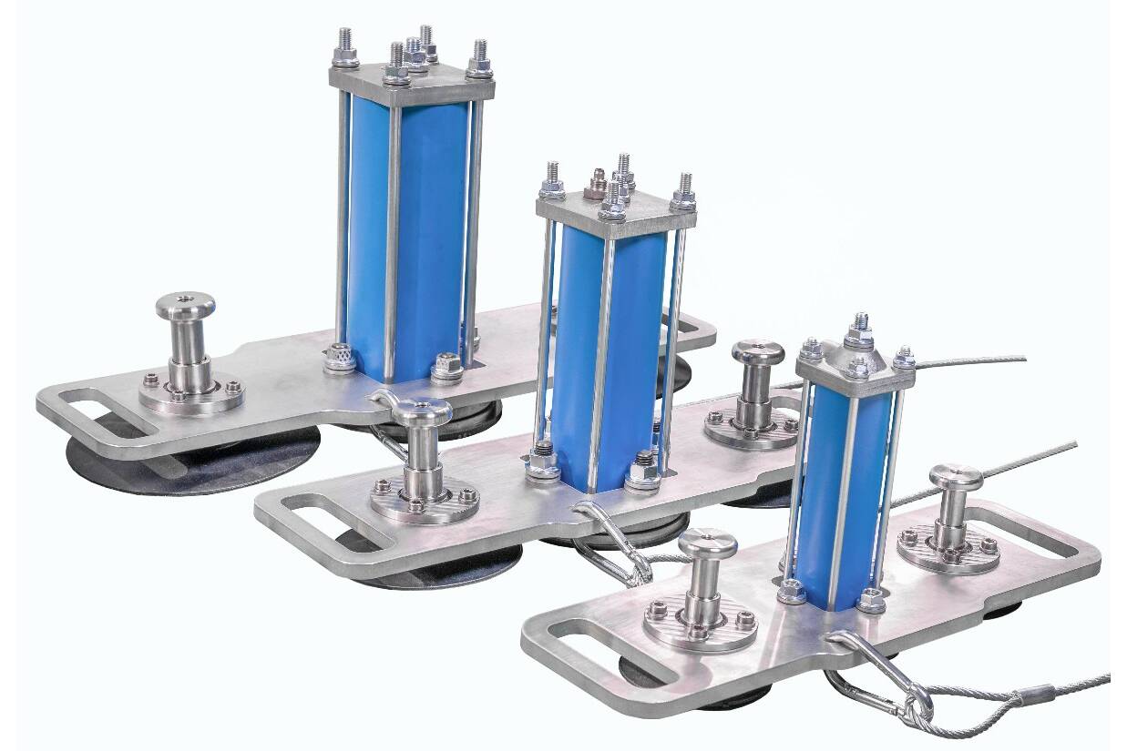 Sicherer Halt und einfache Bedienung bei Schlagkraft. Dank ihrer Federung reißen die Magnete trotz der hohen Schlagkraft des pneumatischen Klopfers nicht ab. Um die starke Haftkraft ohne großen Kraftaufwand lösen zu können, ist der mobile Klopfer mit zwei Montagegriffen versehen, über die auch die Vorspannung der Halterungsfedern eingestellt werden kann.