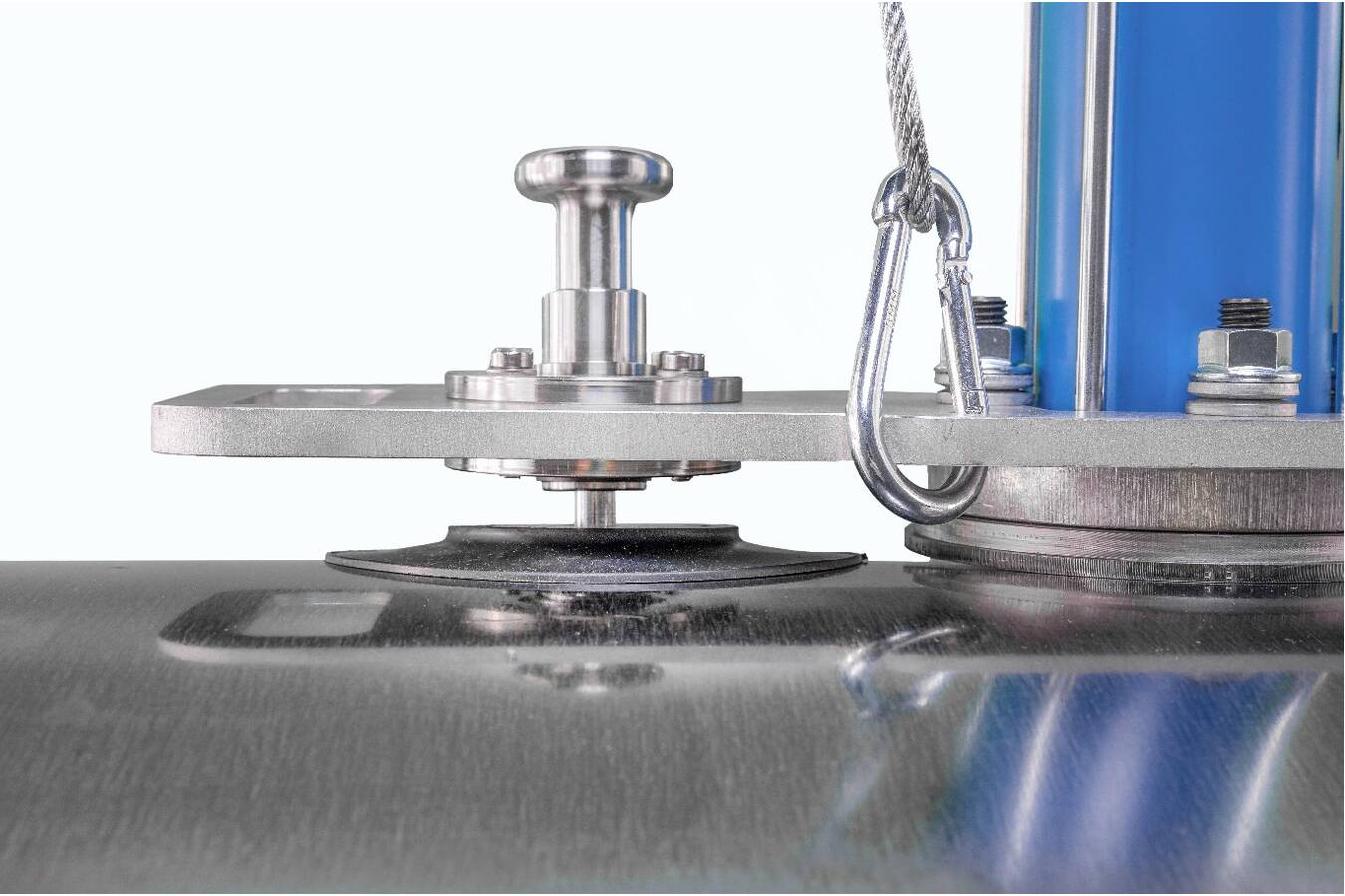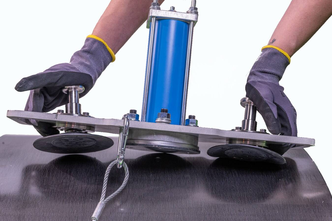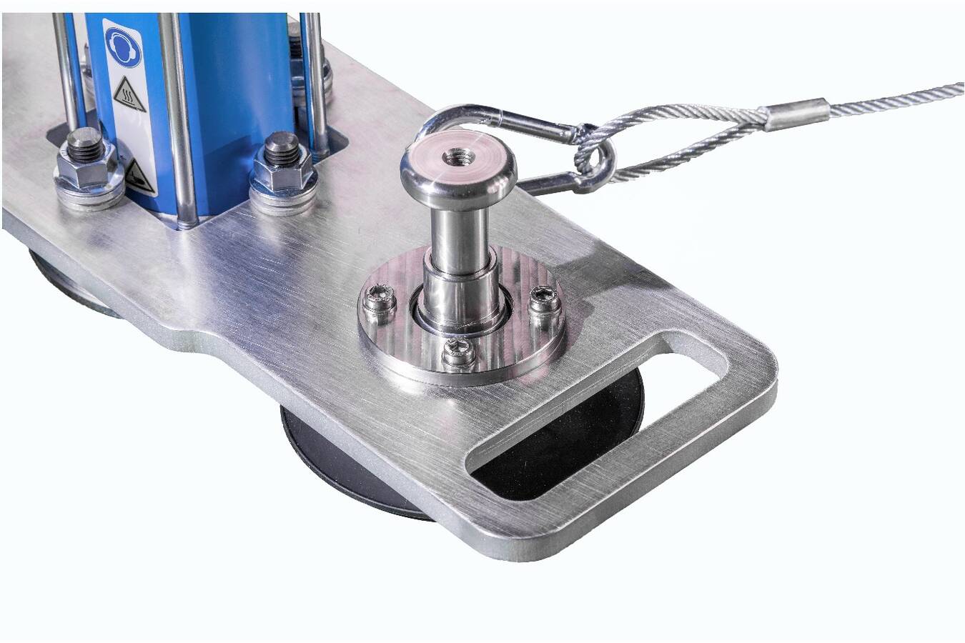 Sicherer Halt und einfache Bedienung bei Schlagkraft. Dank ihrer Federung reißen die Magnete trotz der hohen Schlagkraft des pneumatischen Klopfers nicht ab. Um die starke Haftkraft ohne großen Kraftaufwand lösen zu können, ist der mobile Klopfer mit zwei Montagegriffen versehen, über die auch die Vorspannung der Halterungsfedern eingestellt werden kann.