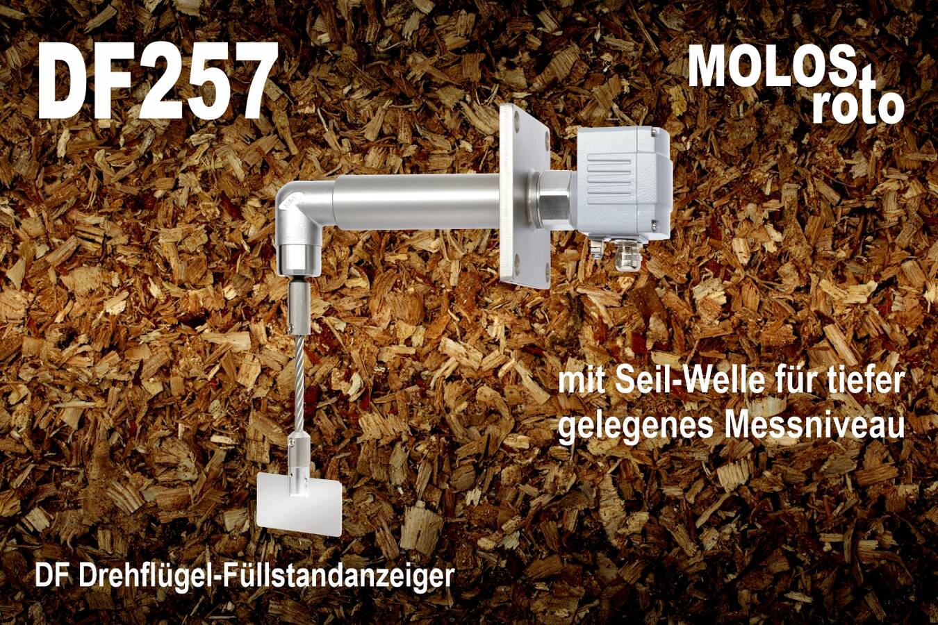 Sie möchten den Füllstand in einem Schüttgutsilo messen und können an der gewünschten Messstelle weder von oben, noch von der Seite ein entsprechendes Messgerät einbauen? Speziell für die Lösung solcher Messaufgaben hat die MOLLET Füllstandtechnik GmbH den MOLOSroto DF257 entwickelt. Dieser Drehflügelmelder ermöglicht mit dem abgewinkelten Ausleger und der hängenden Seil-Welle mit Straffgewicht die Füllstandsmessung auch an sonst nicht erreichbaren Messpunkten. Mit einer maximalen Auslegerlänge von 500 mm und einer Seil-Länge bis zu 5.000 mm ist Füllstandsüberwachung an jedem gewünschten Messpunkt im Silo möglich.