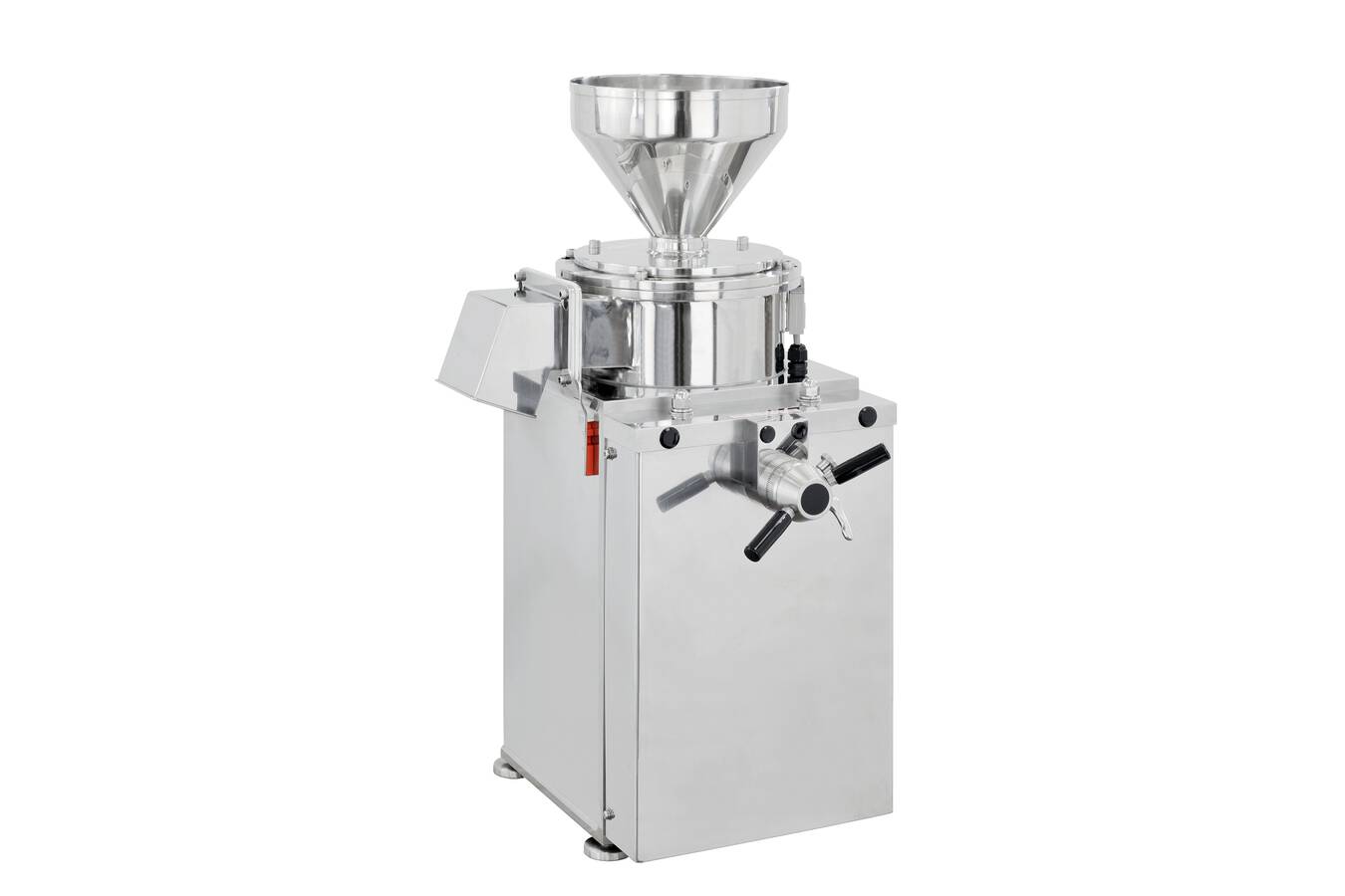 Für die ultrafeine Nass- und Trockenzerkleinerung Die GRANOMAT JP Scheibenmühle beruht auf dem Stator-Rotor-Prinzip, wobei die eine Scheibe festmontiert ist und die andere Scheibe rotiert. Je nach Mahlscheibentyp können Produkte entweder mehlarm zerschrotet (trocken) oder sehr fein (Meist nass) zermahlen werden. Der Durchsatz liegt abhängig vom Ausgangsprodukt, dem Feinheitsgrad und dem Maschinentyp bei 1 bis 3000 kg/h. Die Scheibenmühle ist in 3 Größen mit unterschiedlichen Mahlscheibendurchmessern erhältlich: GRANOMAT JP 150, JP 250 und JP 360. Der auch Kolloidmühle genannte GRANOMAT JP besticht durch sein verblüffend einfaches Handling sowie die außerordentlich gute Reinigbarkeit. Bei folgenden Applikationen kann der GRANOMAT JP eingesetzt werden: Pulverisierung von Lebensmitteln, Emulgierung von Fetten und kosmetischen Produkten sowie Zermahlung von harten Produkten wie Mineralien, medizinischen Produkten, Pigmente u.v.m.