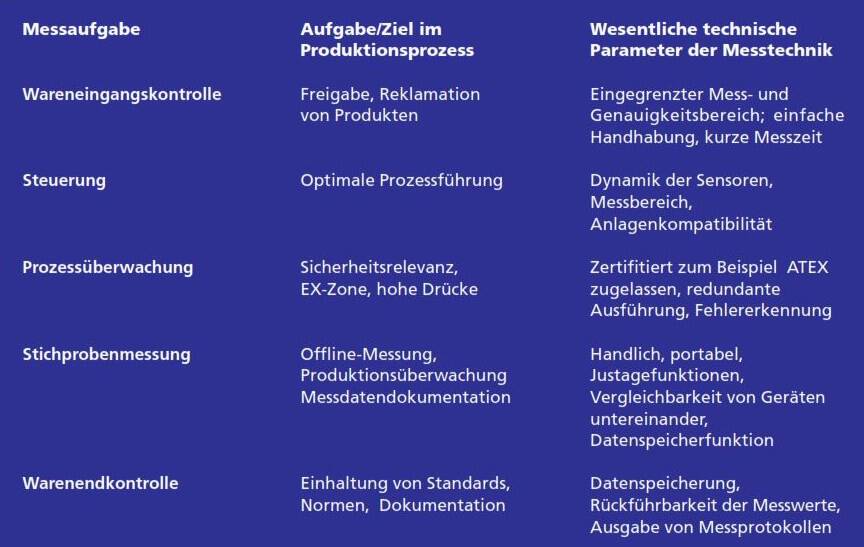 Bevor diese spezifischen Betrachtungen zur Anlage, zum Produkt und zur Messtechnik angestellt werden, muss jedoch Klarheit über die Messaufgabe bestehen: Warum soll gemessen werden? Die Beantwortung der Frage zieht eine Reihe von technischen Konsequenzen nach sich (Tabelle 1).