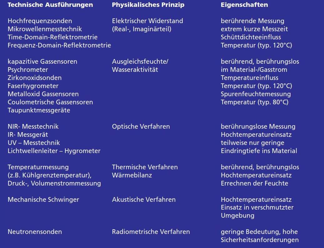 Tabelle 2. Charakterisierung der wesentlichen Online-Messverfahren für die Materialfeuchtebestimmung