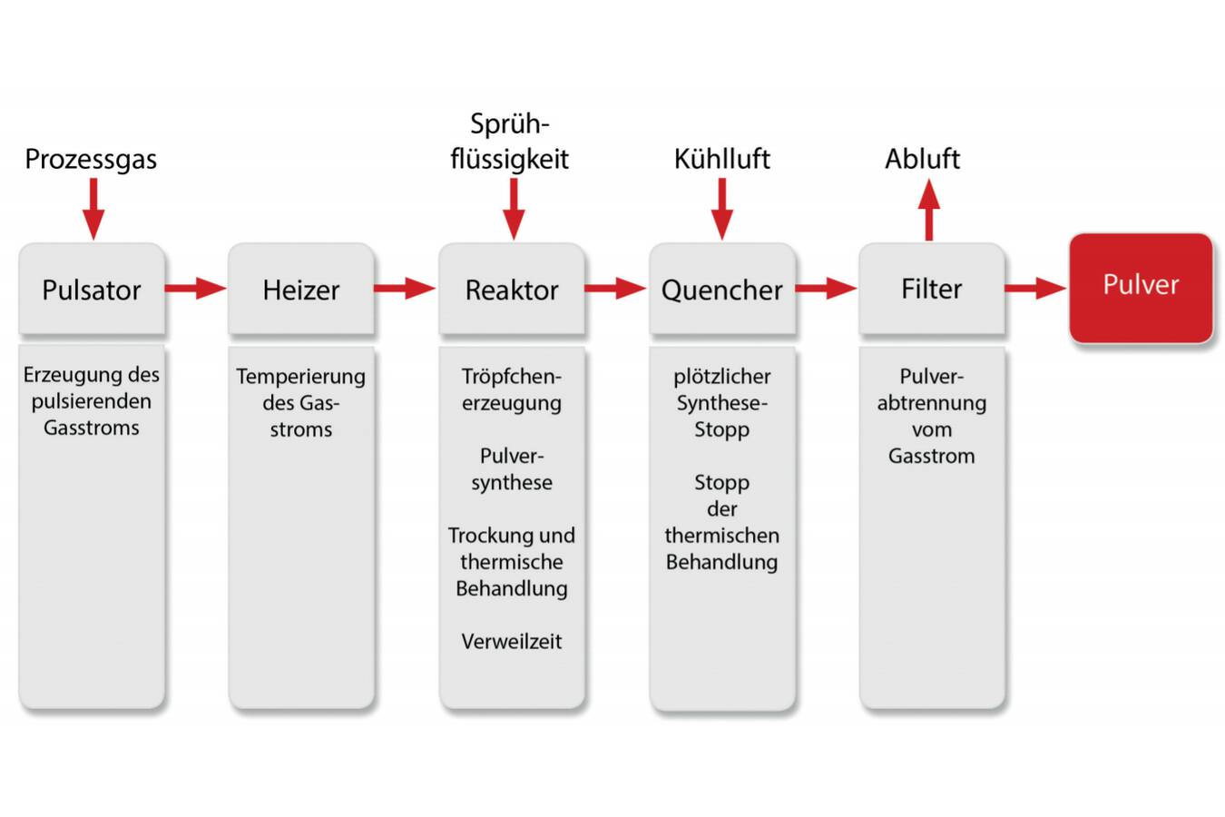 Die Sprühkalzination in einem Heißgasreaktor mit pulsierendem Prozessgasstrom gestattet ein breites Anwendungsspektrum der Pulversynthese unter einzigartigen und homogenen Bedingungen mit zahlreichen Vorteilen bei der Einstellung der Partikeleigenschaften.