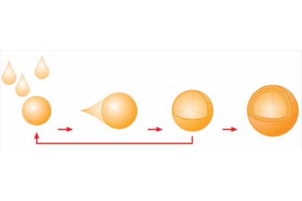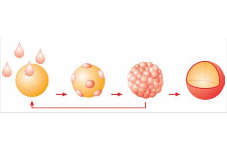 Ein Coating-Prozess beginnt mit dem Füttern des Prozessraumes mit vorliegenden Partikeln, Granulaten oder Pellets. Diese werden in einem Prozessschritt wiederholt mit einer oder mehreren Sprühflüssigkeiten besprüht, die trocknen beziehungsweise erstarren, so dass sich eine Hülle mit sphärischen Schichten aufbaut (Bild 5). Die Qualität eines Coatings wird anhand der Freisetzungskinetik, der Dichtigkeit der Schutzhülle und der mechanischen Festigkeit im Labor überprüft. Das Ergebnis sind Düngemittelgranulate mit ausgeprägter Depotwirkung und definiertem Nährstoffangebot für eine optimale Dosierung und Reduzierung von unerwünschten Drifterscheinungen bei der Ausbringung.
