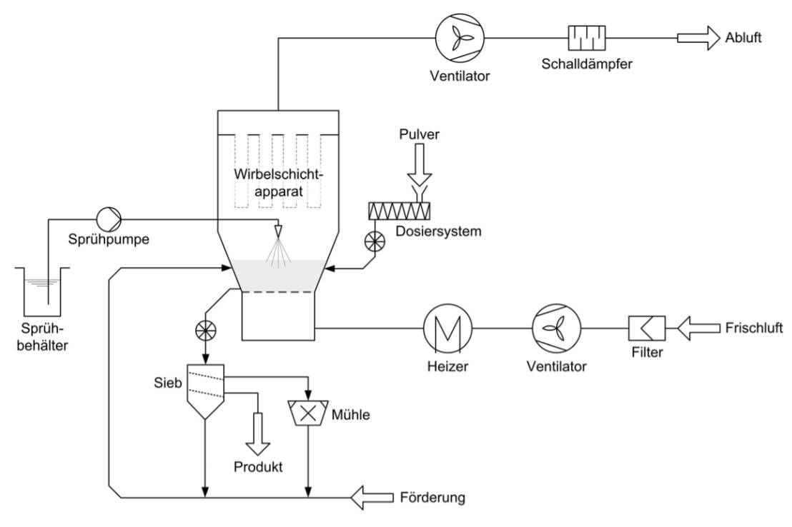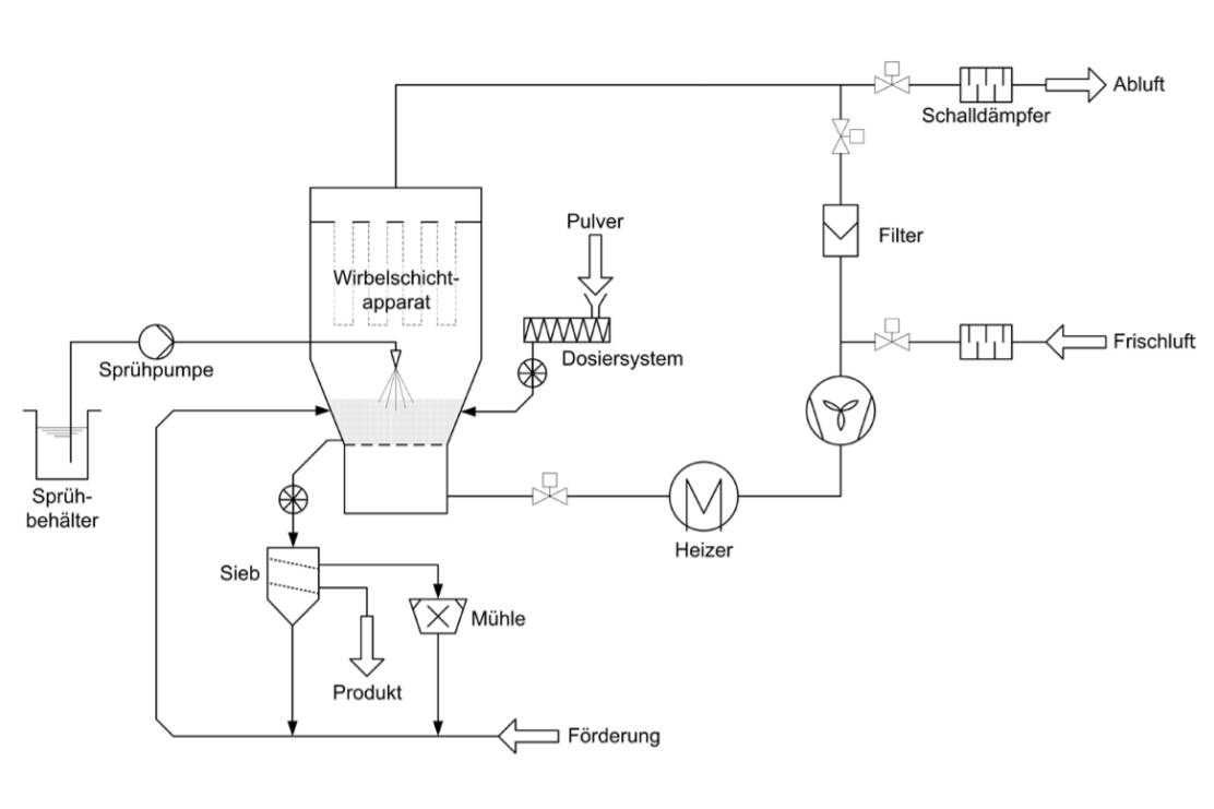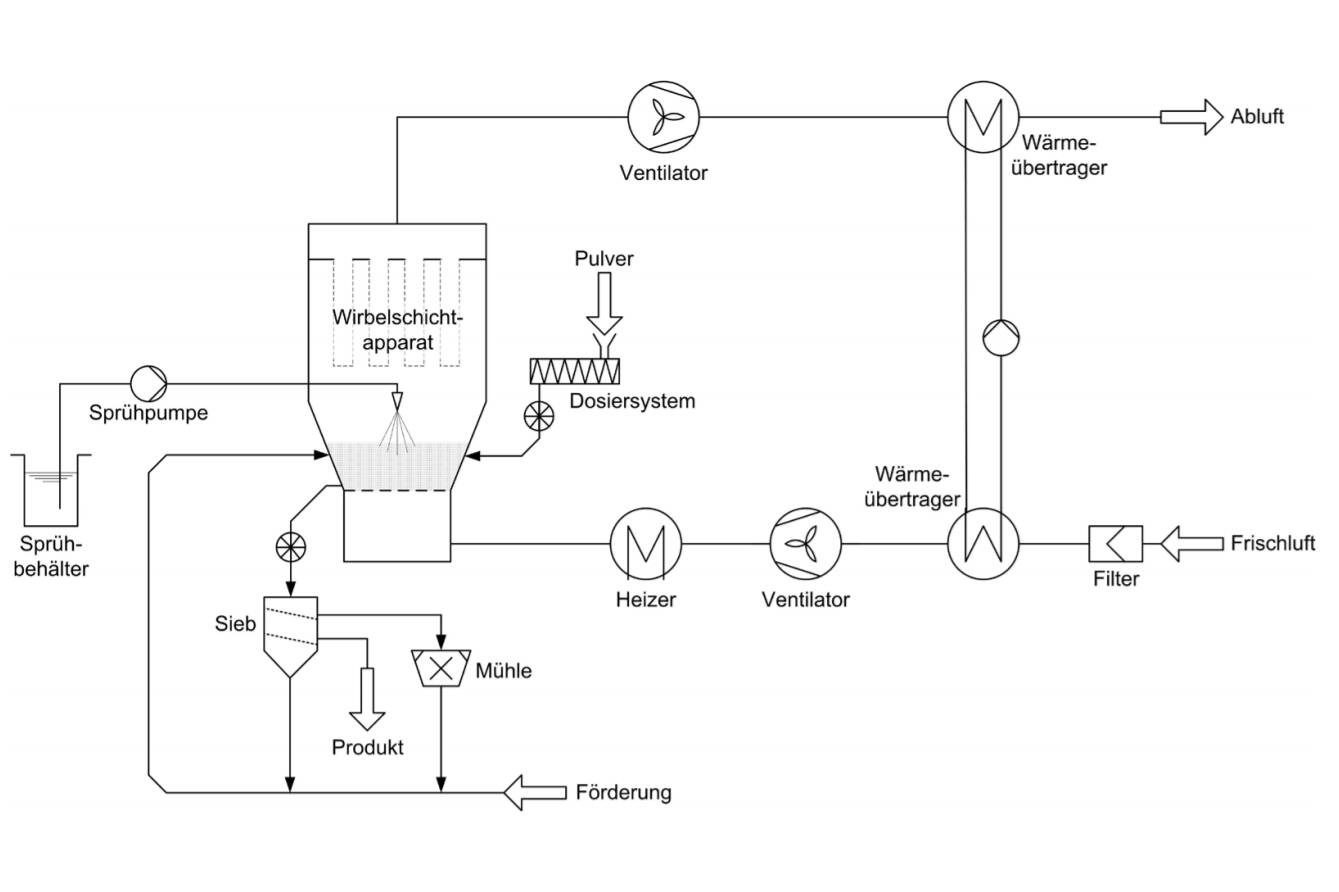 Durch die geringeren Zu- und Abluftmengen kann zudem die entsprechende Ausrüstung kleiner und mit geringeren Investitions- und Betriebskosten gewählt werden, denn die Menge an zuzuführendem Inertgas oder Frischluft ist deutlich niedriger. Es ist zu prüfen, ob die höhere relative Luftfeuchte, die durch die Teilstromrückführung am Eintritt des Granulators verursacht wird, sich auf das Granulatwachstum oder die erreichbare Produktfeuchte auswirken.
