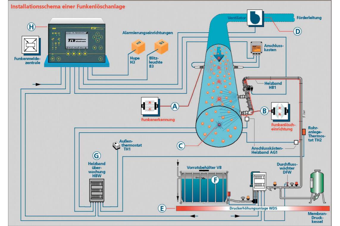 Die Funkenerkennung (A) wird mit mindestens zwei Funkenmeldern realisiert, die den gesamten Rohrleitungsquerschnitt überwachen. Die Funkenlöscheinrichtung (B) besteht aus einem schnell öffnenden Magnetventil sowie mindestens einer Löschdüse. Gegen Verschmutzung sind die Löschdüsen mit einem Verschluss versehen. Die Löschung wird so lange aufrechterhalten, bis der letzte erkannte Funke (C) die Löschstrecke passiert hat, dann schließt die Löschautomatik selbstständig. Die Funkenlöschanlage bleibt weiterhin einsatzbereit, sodass ein neu entstehender Funkenflug sofort wieder bekämpft werden kann. Die minimale Löschzeit beträgt mindestens drei Sekunden und verlängert sich automatisch bei andauerndem Funkenflug. Durch eine einstellbare Funkenschwelle kann eine Maschinenabschaltung (D) vorgenommen werden. Die Anzahl der erkannten Funken sowie die Auslöseschwelle wird an der Funkenmeldezentrale angezeigt. Die Funkenmelder haben eingebaute Testeinrichtungen und die Funkenmeldezentralen (H) eine automatische Meldertesteinrichtung.