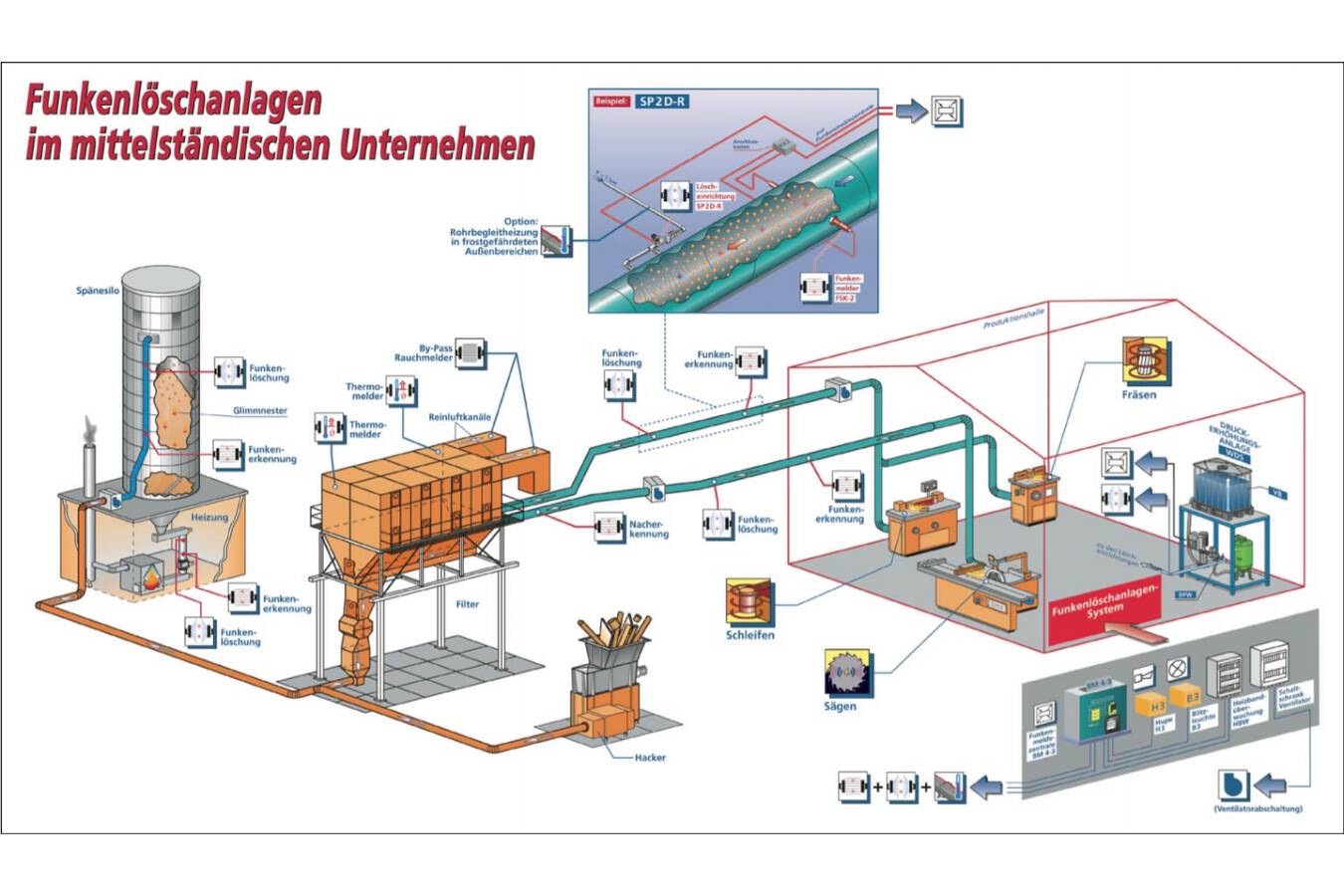 Um dieses Risiko auszuschließen, müssen Maschinen und Absauganlagen auf Funkenflug überwacht und durch geeignete Funkenlöschanlagen gesichert werden.