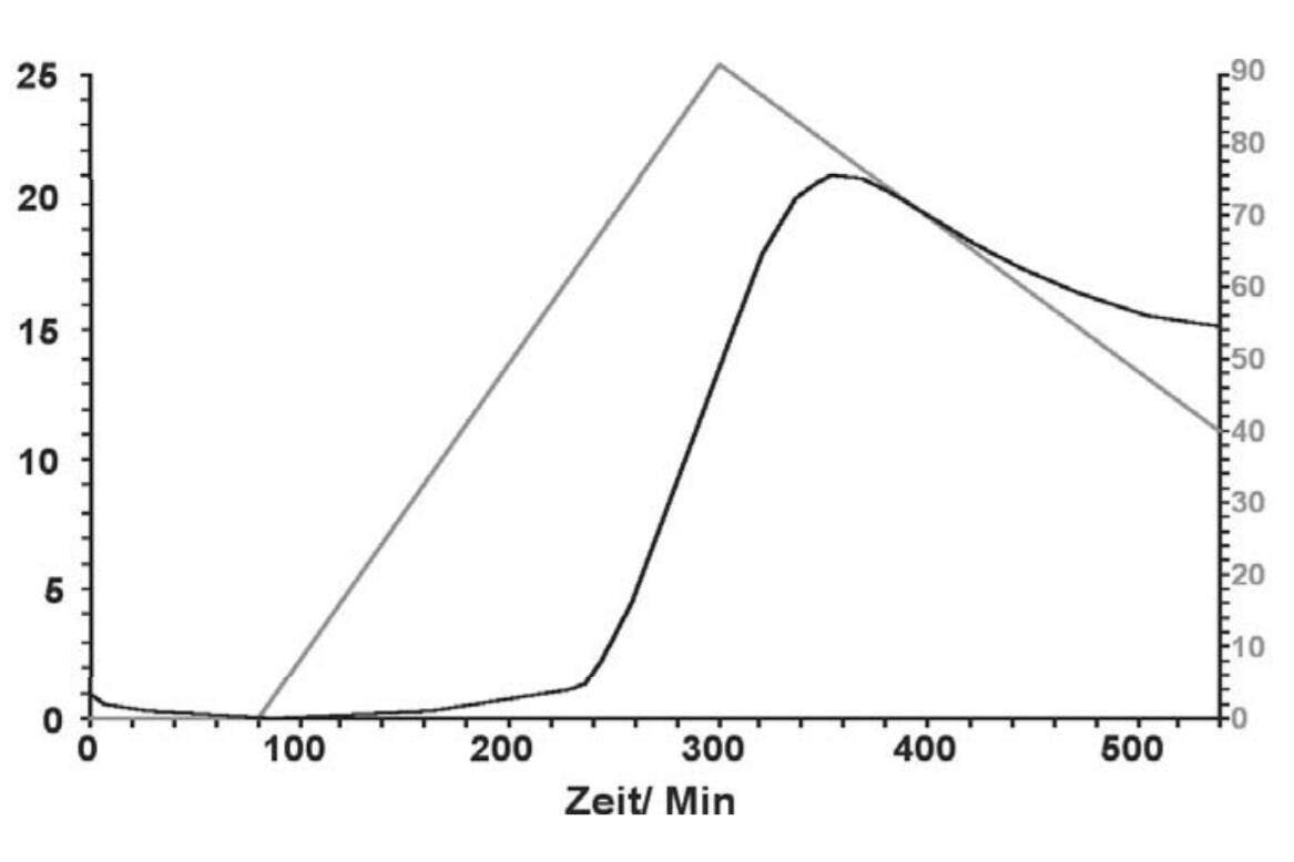 Nach Abschluss der Messung erfolgt die fachgerechte Entsorgung der Materialproben. Ergänzend zur Kennlinienbestimmung können weitere Messungen durchgeführt werden. Bei stark hygroskopischen Produkten (zum Beispiel Produkte in Sprühtrocknern) hinterlässt schon ein kurzzeitiger Kontakt mit hoher Umgebungsfeuchte bleibende Veränderungen. Das Produkt (Abb. 3, rechte Ordinate, Seite 40) wurde einer Umgebungsluft mit einer relativen Luftfeuchte von 90 % r.F. ausgesetzt. Nachdem diese Belastung aus der Umgebungsluft nicht mehr vorhanden ist, bleibt der Wassergehalt des Produktes nachhaltig hoch (Abb. 3, linke Ordinate, Seite 40). Das Produkt hat sich nachhaltig verändert. Nach den Arbeiten im Labor sind für die Übernahme der materialspezifischen Kennlinie in den Produktionsprozess und die Anlage im Wesentlichen Engineering-Arbeiten erforderlich: