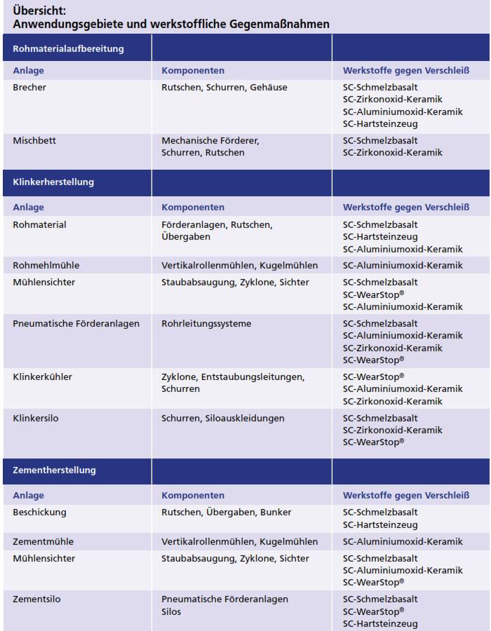 Von der Rohmaterialaufbereitung über die Klinkerherstellung bis hin zur eigentlichen Zementherstellung ist ein Zementwerk in nahezu allen Anlagensystemen von Verschleiß betroffen. Insbesondere die Zugabe von Hochofenschlacken oder Flugasche erhöht den Verschleiß dramatisch. Besonders betroffen sind hier Materialübergaben, Schurren, Mühlengehäuse und deren Sichter sowie pneumatische Förderanlagen.