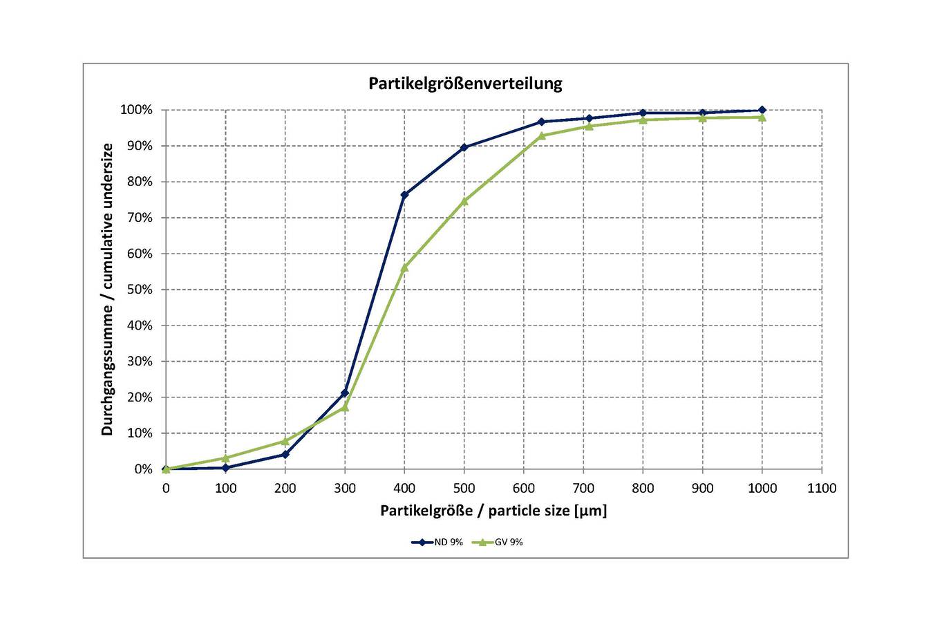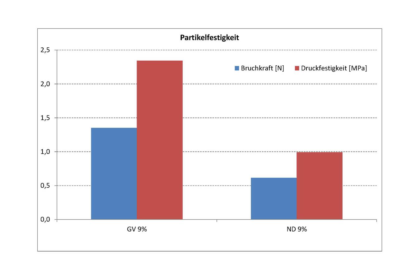 Ein weiterer Prozess typischer Wirbelschichtprozess ist die Agglomeration von Pulvern zu rieselfähigen, staubfreien Granulaten. Um die Einflüsse des Vakuums auf die Granulatbildung zu untersuchen, wurden im Technologiezentrum bei Glatt in Weimar Versuche unter Normaldruck (mit Stickstoffkreislauf) und unter Vakuumbedingungen durchgeführt. Als Modellsubstanz wurde Laktosepulver mit einer 5,5%igen Binderlösung aus Eudragit S 100 und Aceton/Methanol besprüht. Die Zerstäubung im Vakuum erfolgte durch eine Einstoffdüse, wobei die Tröpfchengröße durch die Anpassung der Sprührate eingestellt wurde. Der Binderanteil im Endprodukt betrug 9%. Die Agglomerate (Abb. 1+2) waren sowohl in der Partikelgrößenverteilung (Abb. 3) als auch in der Schüttdichte vergleichbar. Ein deutlicher Unterschied zeigte sich hingegen in der Festigkeit: Die Agglomerate im Vakuum zeichneten sich durch eine mehr als doppelt so hohe Druckfestigkeit (Abb. 4) aus – ein deutlicher Vorteil zum Beispiel für allergene Produkte.