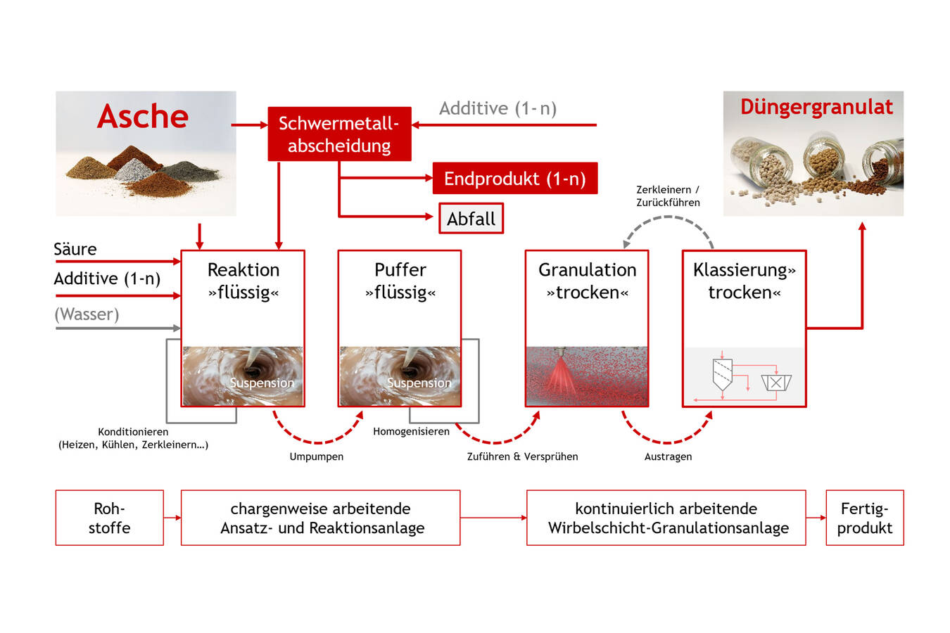 Wie der zweistufige, rückstandslose Prozess „PHOS4green“ aus Klärschlammasche gebrauchsfertigen und phosphorhaltigen Dünger macht. Aufschluss des Phosphates und mittels Wirbelschicht-Sprühgranulation zum Dünger als abfallfreies, marktfähiges Produkt. Wie der zweistufige, rückstandslose Prozess „Phos4green“ aus Klärschlammasche gebrauchsfertigen und phosphorhaltigen Dünger macht. Die bodenbezogene Verwertung von Klärschlamm belastet das Grundwasser und die Gewässer, gesundheitsgefährdende Schadstoffe gelangen über Kulturpflanzen in die Nahrungskette. Durch die gesetzlichen Rahmenbedingungen der Dünge- und der Klärschlammverordnung ist absehbar, dass Klärschlämme in erster Linie der Monoverbrennung zugeführt werden. Infolgedessen wird die Phosphatrückgewinnung aus der Klärschlammasche erfolgen. Bekannte Verfahren zur P-Rückgewinnung produzieren häufig große Mengen Abfall oder erfordern eine bestimmte Rohstoffmatrix. Das neue Verfahren „Phos4green“ von Glatt verbindet den Recycling- mit dem Herstellungsprozess für neuen Dünger und führt zu vertriebsfähigen Produkten. In Kooperation mit Seraplant hat Glatt ein effizientes, marktreifes Verfahren entwickelt, das im ersten Schritt Phosphat