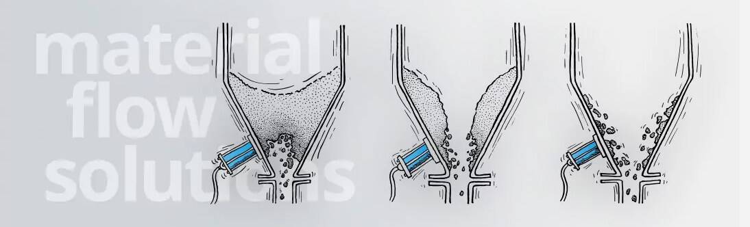 Der Pneumatische Klopfer wird bei Schüttgütern mit Materialflussstörungen wie Brücken-, Schacht- und Restebildung angewendet, wenn hochtourige Vibratoren oder Rüttler mit ihren weichen sinusförmigen Schwingungen nicht wirksam sind.