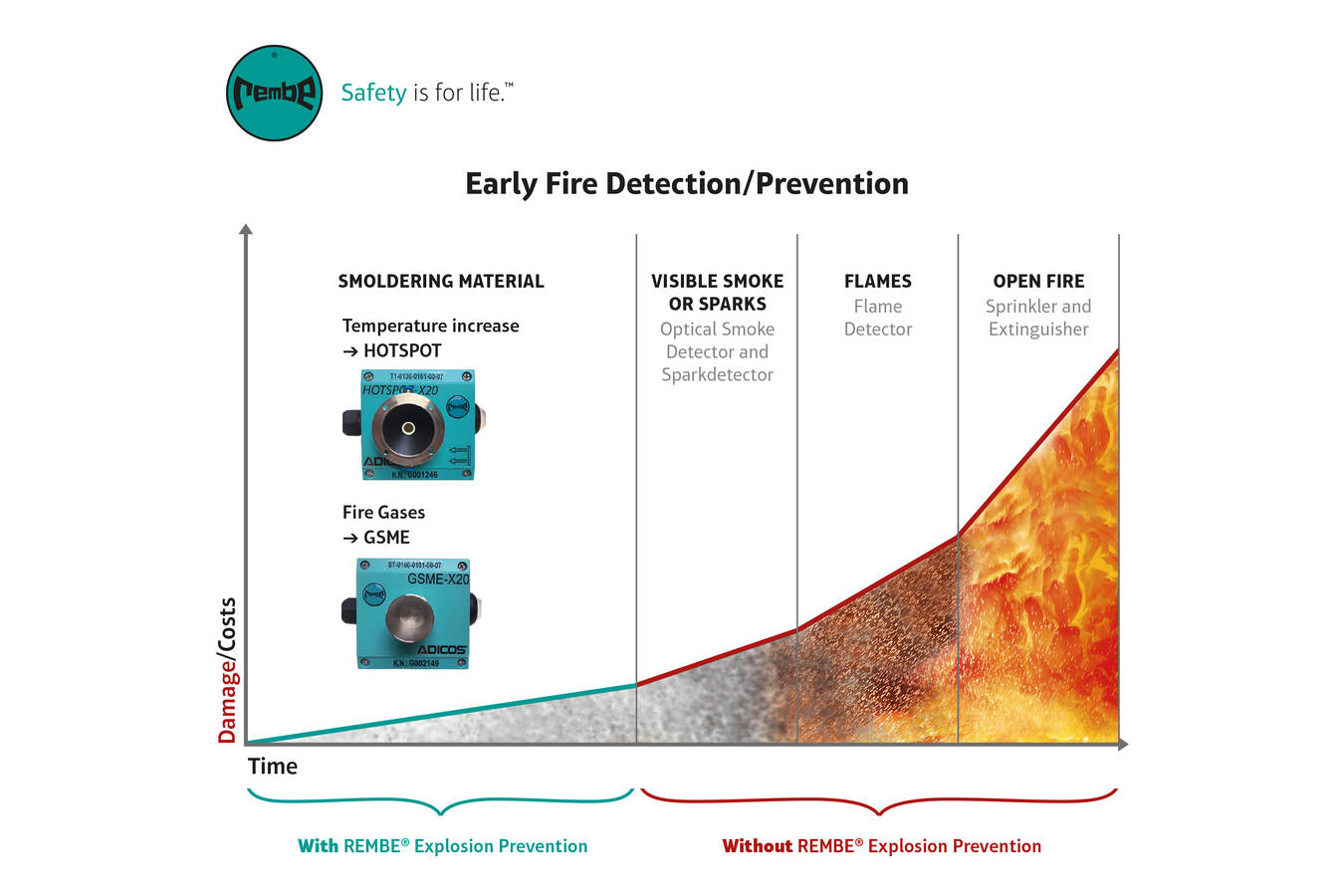 Liegen Brennzahlen größer als 1 vor (Stäube und/oder Komponenten innerhalb der Fördereinrichtung) werden bereits erste vorbeugende Schutzmaßnahmen gefordert [3]. Ergänzend zu den oben bereits genannten Maßnahmen können auch Brandgasdetektoren und Temperaturüberwachungen eingesetzt werden, um das Risiko weiter zu minimieren.