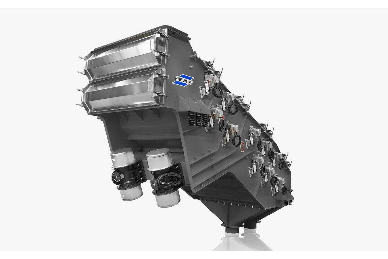 Weitere Sieblinien mit der RHEWUM RHEsonox und ihrem direkt erregten Siebgewebe trennen in mehreren Stufen Nebenprodukte aus dem Substrat zur Weiterverarbeitung oder Wiederverwendung. Frass und Substrat können durch die direkte Erregung bei einer Schwingungsfrequenz von 50 Hz effizient voneinander getrennt werden. Durch die Nutzung von Edelstahlgeweben für die nicht lebenden Fraktionen können deutlich höhere Durchsätze erreicht werden, da Drahtgewebe eine vielfach höhere offene Siebfläche als PU-Beläge aufweisen und zudem mit feineren Maschen hergestellt werden können. Die Siebgewebe sind dabei längs gespannt und werden von bis zu vier Tellerfederpaketen über die gesamte Siebbreite konstant in Spannung gehalten. So müssen nur maximal vier Muttern je Gewebe gelöst werden. Das Wechseln eines Siebgewebes dauert damit nur 5 bis 10 Minuten und kann auch bei diesem Maschinentyp in jedem Siebdeck einzeln durchgeführt werden. Ebenso gewährleistet der automatische Abreinigungszyklus der Siebgewebe durch die von RHEWUM entwickelten und gefertigten elektromagnetischen Schwingköpfe einen konstant hohen Durchsatz. Die Amplitude der Schwingköpfe kann in jedem Siebdeck und sogar ein- und auslaufseitig individuell eingestellt werden, um den Siebprozess optimal an das jeweilige Produkt anzupassen. Durch die Vielzahl an kleinen Antrieben ist zu jeder Zeit eine hohe Produktionssicherheit gewährleitest. Fällt einer diese Antriebe aus, kann die Maschine problemlos weiterlaufen. Das gesiebte, hochreine Substrat kann in der Aufzucht weiterverwendet werden und muss nicht ersetzt werden. Der gewonnene Frass kann als natürlicher Dünger genutzt werden. Somit ergibt sich ein geschlossener Kreislauf ohne Abfallprodukte. Je nach Anforderung können auf weiteren, übergeordneten Siebdecks auch Agglomerate oder Eier aus Substrat und Frass getrennt werden. Dies hängt immer von der Art des verwendeten Substrats sowie der prozentualen Zusammensetzung ab und kann im RHEWUM-eigenen Technikum getestet werden. So kann RHEWUM für alle Siebaufgaben die bestmögliche Konstellation an Siebtechnologie bereitstellen.