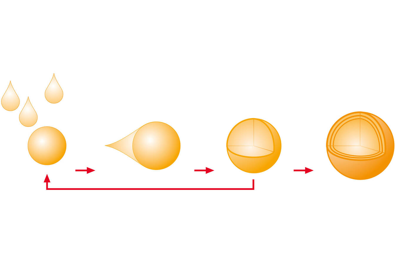 Bei der Sprühgranulation in der Wirbelschicht werden Flüssigkeiten in staubfreie Granulate mit kompakter, homogener Struktur und dichter Oberfläche sowie hoher Abriebfestigkeit verwandelt. Bei PHOS4green ist diese Flüssigkeit eine Phosphatsuspension. Das Gemisch aus festen und flüssigen Komponenten in dieser Suspension wird in die Prozesskammer eines Wirbelschichtapparates gesprüht. Durch den hohen Wärmeaustausch verdunsten bzw. verdampfen die wässrigen oder organischen Lösemittel sofort und die Feststoffe bilden kleine Partikel als Trägerkerne. Diese werden mit weiterer Flüssigkeit benetzt, die wiederum nach der Trocknung einen festen Mantel um den Trägerkern bilden. Dieser Vorgang wiederholt sich. Die Granulate wachsen dabei schichtweise und homogen. Es ist keine separate Zuführung von Rohstoffen erforderlich (Abb. 3). Durch den schichtweisen Aufbau entstehen so feste, kompakte und runde Vollkugeln (= Granulate) mit zwiebelförmiger Struktur. Der Prozess der Sprühgranulation ermöglicht ein hohes Maß an Flexibilität, da Partikel aus verschiedenen Feststoffschichten gebildet, Kerne beladen und beschichtet werden können. Sobald die Sollgröße der Düngerkörnchen erreicht ist, wird das Produkt ausgetragen und kann direkt verpackt, vermarktet und dosiert werden.