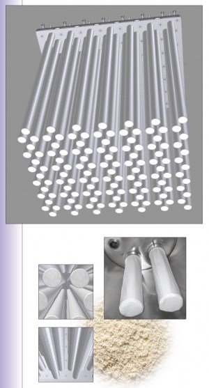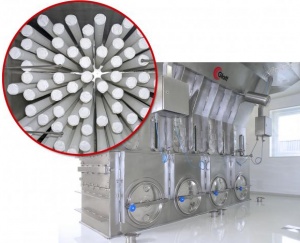 Glatt hat erstmalig Filterelemente waagerecht in eine Wirbelschichtanlage eingebaut. Die Anlagehöhe wird reduziert, da sich die Reingaskammer an der Seite der Anlage befindet. Über der Anlage ist kein Wartungsraum erforderlich. Türen ermöglichen einen leichten Zugang zu den Filterelementen, deren Austausch nun deutlich einfacher ist als von oben.