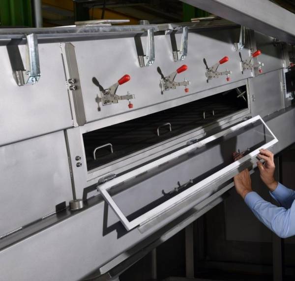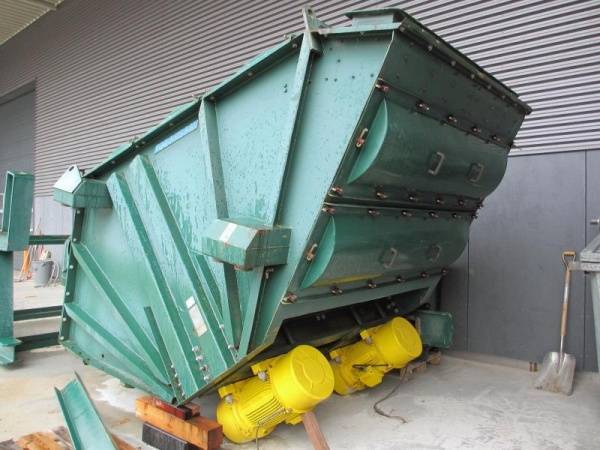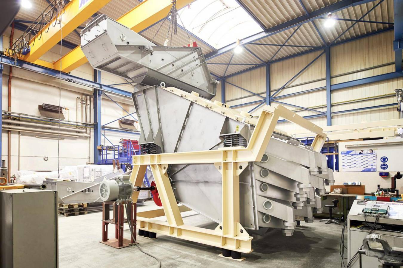 zum Kauf bei Surplus Select Mogensen SC 2046 Sizer, Siebmaschine mit 4 Siebdecke für Trennung in 5 Fraktionen, ein Siebdeck ausgestattet mit Pneumatische Reinigung inkl. Reinigungsschaltschrank, inkl. Siebeinsätze (1x 2,24, 2x 2,0, 2x 1,8, 2x 1,4, 2x 1,25, 2x 1,0, 2x 0,5, 2x 0,4 en 3x 0,71x60 mm), pro Siebdeck sind 2 Siebeinsätze benötigt, 2x 7kW Umwuchtmotoren inkl. separat mitgelieferte elektronische Motorbremse, Gewicht Siebmaschine (vibrierende Teil) etwa 4290 kg, die Siebmaschine ist auf ein originales Isolierrahmen aufgestellt, inkl. einlauf/verteil trichter, die Siebmaschine ist gebraucht für Sand, etwa 40 Ton/h (Dichte 1,6 Ton/m3), Handbuch anwesend (Niederländisch)