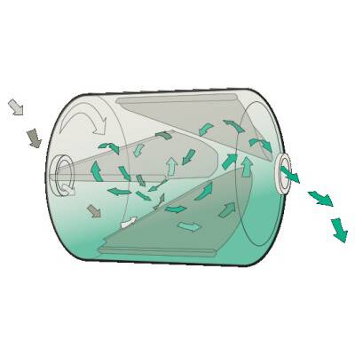 Das einzigartige Mischkonzept zeichnet sich dadurch aus, dass die Konstruktion völlig ohne interne Rührwerke auskommt. Der hervorragend sanfte, aber gründliche Mischen- und Verschneidungs-Effekt wird durch intern festgelegte, aerodynamisch geformten Schaufeln erreicht.