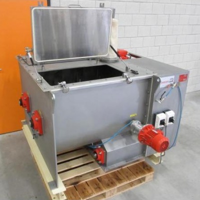 zum Kauf bei Surplus Select Paddelmischer, V2A, 350 Liter, beheizbarer Doppelwellen-Paddelmischer aus Edelstahl für hochviskose Produkten, 2 Austragschnecken, Doppelmantel für heißes Wasser (2 bar, 95°C) auf beiden Seiten des Mischers und unter den Austragschnecken, 2 Klappdeckel mit Sicherheitsschalter, je Mischwelle ein 7,5 kW SEW Antrieb mit 62 UpM, für den Austragschnecken ein 4 kW SEW Antrieb, Abmessungen 1,45 x 1,84 m (LxB), wenig genutzt, gebraucht in der Lebensmittelindustrie Produktnummer: 1.3A2759 Mehr (gebrauchte) Mischer und sonstige Anlagen für die Schüttgutindustrie finden Sie auf unserer Website.