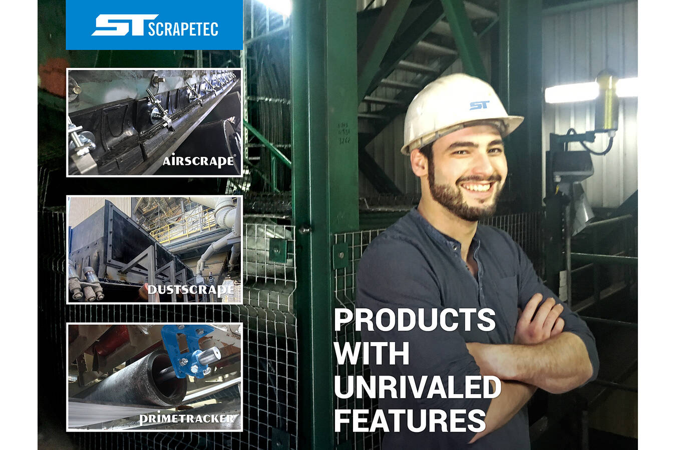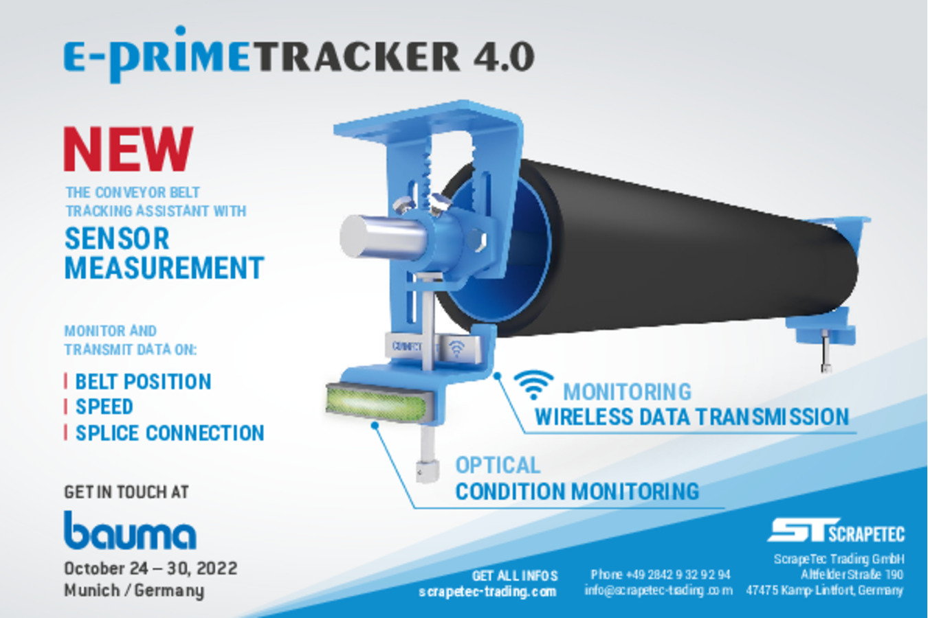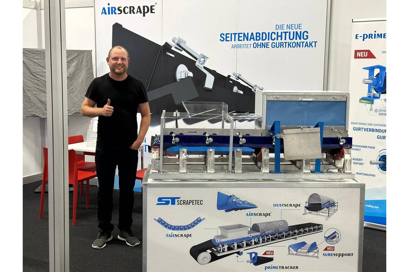 Scrapetec präsentiert erfolgreich ein neues Lenkrollensystem gegen Förderbandschieflauf Neu im Sortiment an Förderkomponenten von Scrapetec ist das Lenkrollen System der PrimeTracker, der Probleme im Zusammenhang mit Förderbandsystemen wie Schieflauf, Verschleiss und Bandschäden beseitigt.