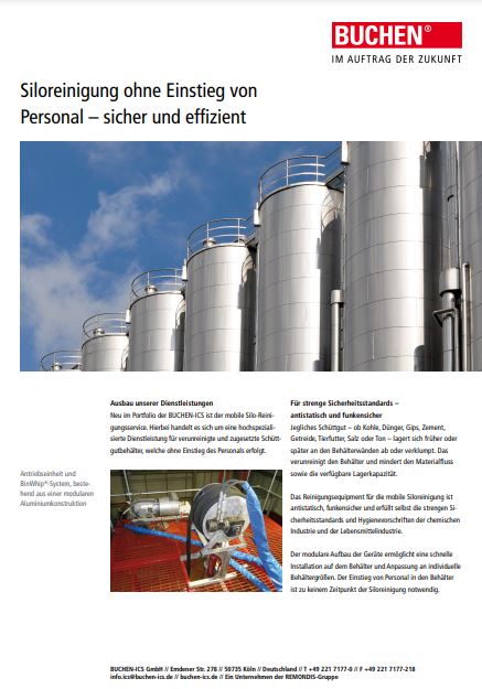 Die Siloreinigung von BUCHEN-ICS ist eine hochspezialisierte Dienstleistung für verunreinigte und zugesetzte Schüttgutbehälter, die ohne Einstieg des Personals erfolgt. Jegliches Schüttgut – ob Kohle, Dünger, Gips, Zement, Getreide, Tierfutter, Salz oder Ton – lagert sich früher oder später an den Behälterwänden ab oder verklumpt. Das verunreinigt den Behälter und mindert den Materialfluss sowie die verfügbare Lagerkapazität.