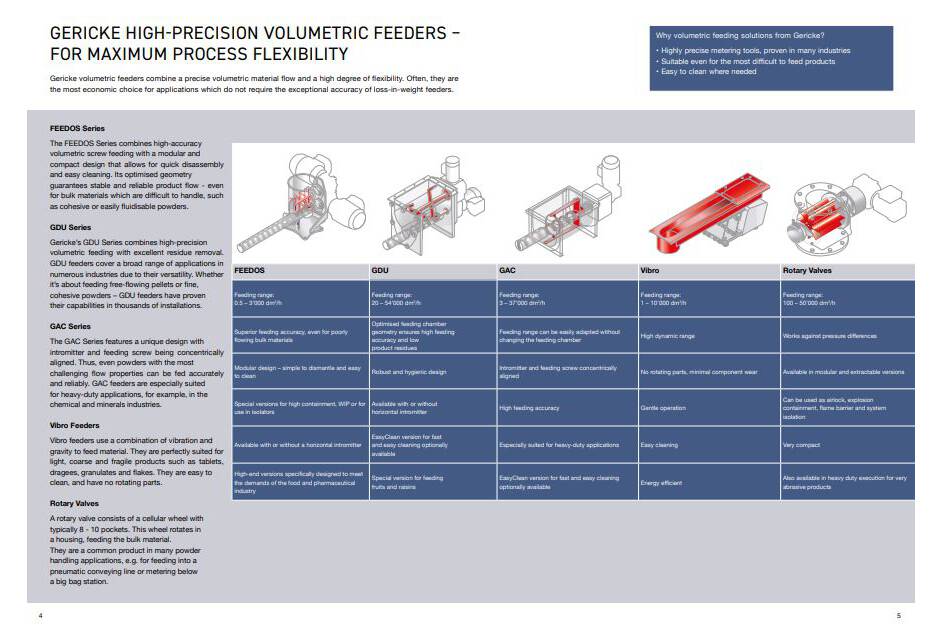 Darüber hinaus werden volumetrische und gravimetrische Ausführungen behandelt sowie die neue Turbo Compact Mixing Produktlinie TCM, die Dosieren und kontinuierliches Mischen in einem sehr kompakten und leicht zu reinigenden Design vereint.