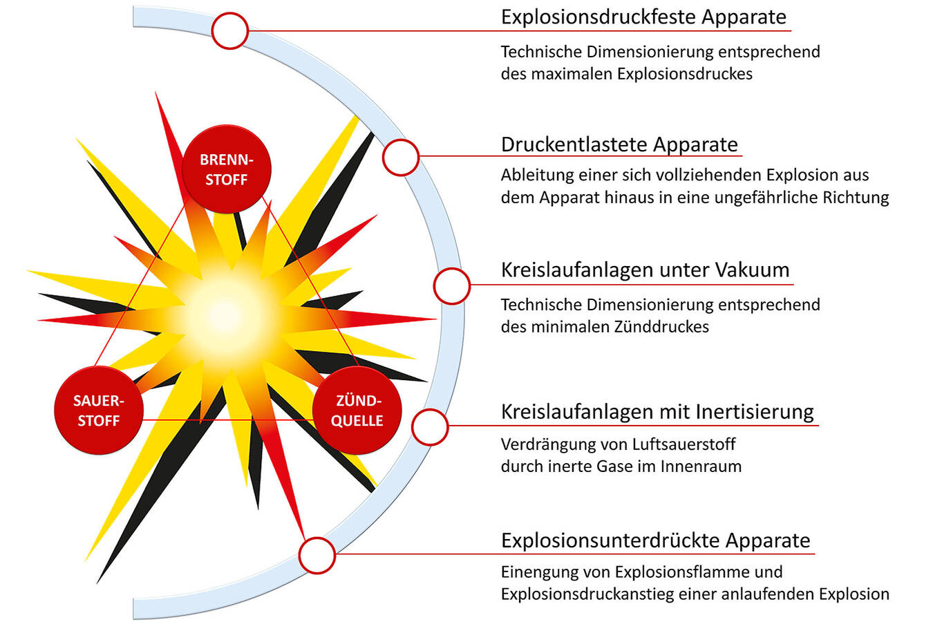 Glatt bietet verschiedene explosionsverhütende Vorrichtungen und Maßnahmen an, die nicht nur rechnerisch beurteilt, sondern auch in praktischen Explosionsversuchen bestätigt wurden. Zündquellen werden soweit möglich vermieden, alle Teile geerdet und ein entsprechendes Anlagendesign gewählt, um maximale Sicherheit zu gewährleisten. Kunden können auf das für sie beste Konzept zurückgreifen, sei es eine Explosionsunterdrückung, Druckentlastung, Inert-Kreisgas- oder Vakuum-Betrieb.