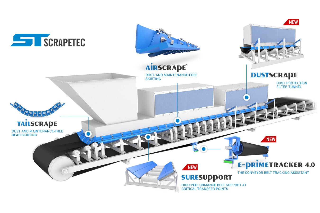 Mit Know-how aus mehr als 30 Jahren im Bereich der Fördertechnik, analysieren wir kritische Punkte in Fördersystemen und entwickeln neue kostengünstige Lösungsmöglichkeiten zur Verbesserung und Optimierung. Mit dieser Innovationsstrategie entwickeln wir einzigartige Produkte wie den AirScrape, DustScrape und den SpeedScrape. Die Neuentwicklungen aus unserem Hause ermöglichen mit niedrigen Kosten und geringem Montageaufwand eine erhebliche Vermeidung von Staubentwicklung, Verschüttungsverbesserungen und eine schonendere und effizientere Gurtreinigung an kritischen Stellen entlang der Förderwege und an Übergabestellen.