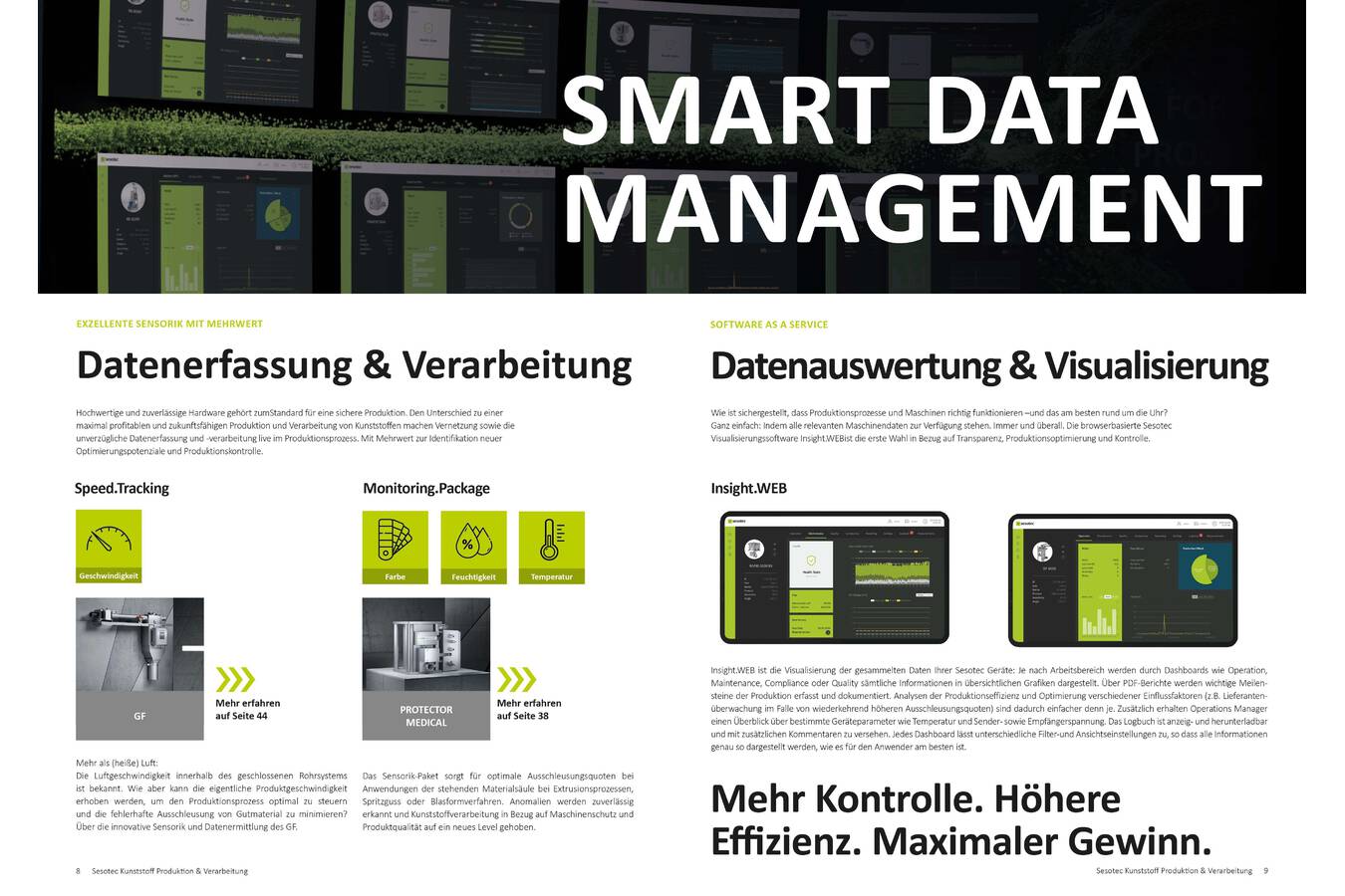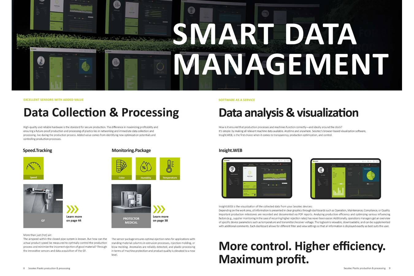 Die Broschüre beginnt mit Kapiteln, die speziell auf die Anforderungen sowohl von Kunststoffherstellern als auch von kunststoffverarbeitenden Unternehmen entlang ihrer Produktionslinien eingehen. Sesotec gibt hier bereits eine Vision für die Zukunft der Branche: Die Einführung beleuchtet das Zusammenspiel von Hightech-Sensorik für die Datenerfassung und -verarbeitung, deren Auswertung und Visualisierung über Softwareanwendungen für maximale Planungssicherheit und Kontrolle über die Fertigungsprozesse. Der Hauptteil widmet sich der Detektions-Hardware, jedoch wird anstelle einer reinen Feature-Aufzählung jeder Gerätekategorie ein praktischer Überblick über konkrete Kundenanwendungen gegeben, sodass die für den Kunden relevanten Geräte sofort erkennbar sind. Abgerundet wird die Übersicht mit dem umfangreichen Service-Portfolio, das allen Sesotec-Kunden weltweit zur Verfügung steht. Es gewährleistet nicht nur die Inbetriebnahme und Funktionalität der Anlagen, sondern verlängert auch deren Lebensdauer.