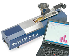 Mit der Entwicklung dieses hochauflösenden, photooptischen Messgerätes kommt Haver & Boecker dem Wunsch vieler Anwender nach, auch feinstes Material wie Pulver effizient vermessen zu können. Das HAVER CPA 2-1 HR ist mit der neusten HAVER CPA Software ausgestattet, die durch eine komfortable Installation, die benutzerfreundliche Menü-führung und übersichtliche Ergebnisdarstellung überzeugt. Durch den Einsatz einer GigE-Kamera lässt sich das HAVER CPA 2-1 HR mit einem Notebook betreiben. Dank der Kombination aus HAVER REAL TIME Funktion und Einzelkameratechnologie kann das Gerät auch als Zählgerät benutzt werden. Zur gleichmäßigen Förderung von feinstem Material und zum Brechen von Agglomeraten wurde von Haver & Boecker eine völlig neue modulare Dispergie-rung entwickelt.