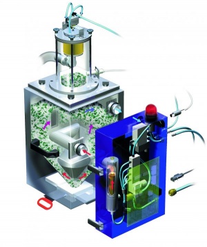 Durch Kombination von 2-5 Ventilen im Binärcode mit unterschiedlichen Düsendurchmessern lassen sich so bis zu 32 verschiedene Trockenluft-Volumenströme realisieren. Damit sind durchsatzbezogene Trockenprogramme, absolut wiederholgenau, in Verbindung mit kunststoffspezifischen Einstellungen mittels editierbarer Datenbank möglich.