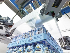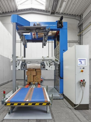 Mit einem neuartigen, materialschonenden Folientransportsystem wird die zuvor erstellte Folienhaube der Anlage zugeführt. Auf dem Weg zur Reff- und Stretcheinheit kühlt die Schweißnaht der Folienhaube bereits ab, so dass diese ohne Zeitverlust gerefft werden kann. Damit sind weder eine energieaufwändige Kühleinheit noch zeitraubende Kühlzeiten erforderlich. Die Paletten können in einer schnelleren Taktung verpackt werden. Das reduziert Stillstandzeiten und sorgt zudem für eine höhere Verpackungsleistung bei geringerem Energieverbrauch.
