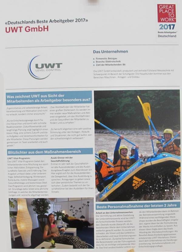 UWT erreichte bereits in 2013 beim regionalen Great Place to Work® Wettbewerb “Beste Arbeitgeber im Allgäu 2013“ den 1. Platz in der Größenklasse „Unternehmen mit 50-500 Mitarbeitern“ und wurde in 2014 mit dem Award „Deutschlands Beste Arbeitgeber 2014“ ausgezeichnet. Nach einer bewussten Pause in 2015 nahm die UWT letztes Jahr wieder an diesem angesehenen Wettbewerb teil.