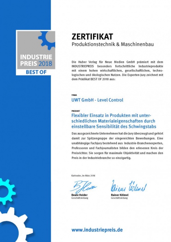 Die Experten-Jury zeichnete UWT mit dem Prädikat BEST OF 2018 für die einstellbare Sensibilität des Schwingstabs Mononivo® aus, was den flexiblen Einsatz in einer Vielzahl an Produkten mit unterschiedlichen Materialeigenschaften ermöglicht.