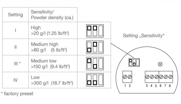 Die innovative 4-stufig einstellbare Sensibilität des Schwingstabs Mononivo® 4000 macht den Betrieb dieser Sensorik absolut flexibel im Einsatz in Materialien mit ganz unterschiedlichem Schüttgewicht und Schüttguteigenschaft. Die Sonden sind werkseitig auf Stellung „III“ eingestellt, um die meisten Anwendungen abzudecken. Falls das Schüttgut zur Anbackung neigt, besteht die Möglichkeit, den Einstellschalter auf Stellung „IV“ umzulegen, um die Sonde unempfindlicher zu machen. Bei leichtem Schüttgut mit wenig oder keiner Ansatzbildung kann auf Stellung „II“oder „I“ umgestellt werden, um die Sonde empfindlicher zu machen. Je nach ungefährem Schüttgewicht kann die entsprechende Einstellung passend gewählt werden. So bietet der MN Schwingstab durch seine flexibel einstellbare Empfindlichkeit eine kompakte und nutzerfreundliche Lösung für Anlagen mit Prozessen, in denen unterschiedliche Materialien verarbeitet werden.