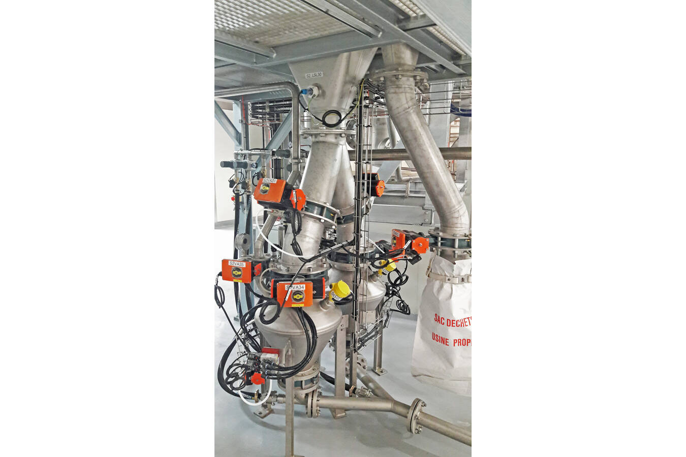 Eine pneumatische Dünnstromförderung mit Unter- oder Überdruck wäre möglich gewesen. Da das Pulver jedoch sehr schonend behandelt werden musste, um die Entstehung von Feinanteilen während des Transports zu minimieren, wurde ein Dichtstromfördersystem Gericke PulseFlow PTA mit zwei Sendebehältern gewählt. Die beiden 20-Liter-Druckbehälter wurden nebeneinander platziert und direkt unter der kontinuierlich austragenden Zellenradschleuse angebracht. Das Schokoladenpulver wird mit einer Leistung von 1,5 t/h in einen Druckbehälter gegeben, während der andere Behälter pneumatisch fördert. Die beiden Druckbehälter arbeiten alternierend und erzeugen somit einen kontinuierlichen Förderstrom.