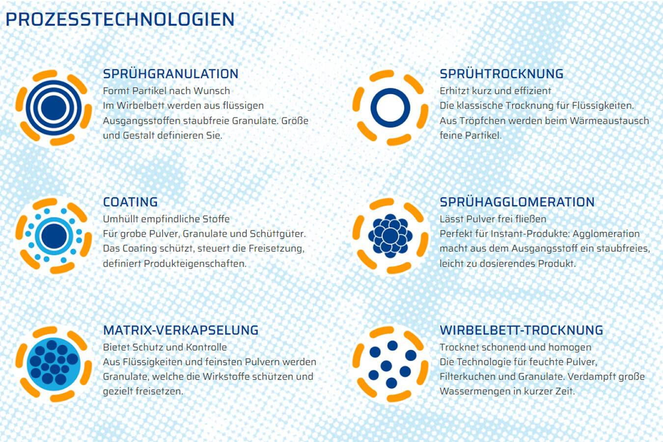 Bei der Wirbelschichttechnologie werden die Einsatz- und Rohstoffe von einem Gasmedium durchströmt. Durch diese Strömung werden die Partikel in einen fluidisierten Zustand versetzt - sie vermischen sich mit dem Medium. Das Ergebnis ist eine fließfähige, aufgelockerte Masse aus feinkörnigen Partikeln, eine so genannte Wirbelschicht. Im Wirbelschichtverfahren werden die Rohstoffe auch schnell getrocknet oder veredelt, wenn Verfahren wie Sprühgranulation, Coating oder Sprühagglomeration eingesetzt werden.