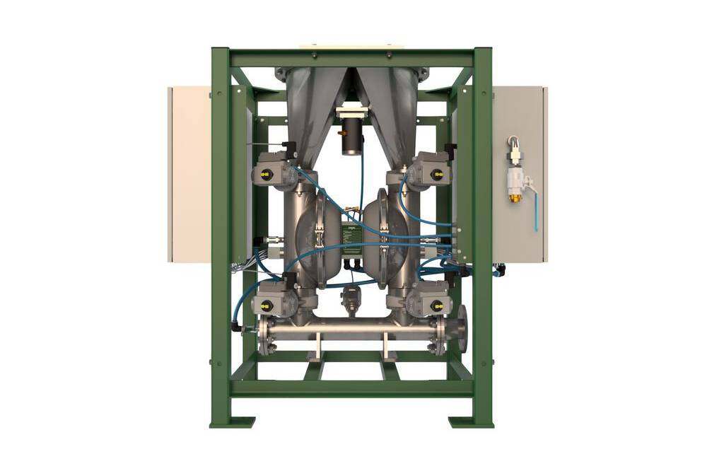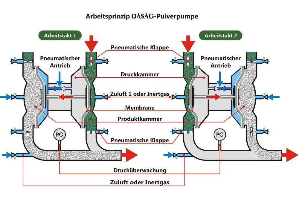 Die DASAG-Pulverpumpe ist eine spezielle Entwicklung zur Förderung von Schüttgütern, basierend auf dem Prinzip einer Doppelmembranpumpe.