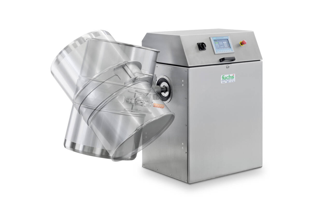 Der Mischvorgang selbst ist besonders schonend und effektiv: Der Mischbehälter, der bis zu 70 % seines Volumens gefüllt ist, wird während der vor eingestellten Mischzeit kopfüber gedreht. Da der Behälter in einer geneigten Position auf der Halterung montiert ist, entsteht ein dreidimensionaler Mischeffekt, der die Mischung gleichmäßig verteilt. Ein statisches Mischkreuz, das am Deckel angebracht ist, beschleunigt den Vorgang zusätzlich und sorgt für eine rückstandsfreie, homogene Mischung. Das fertige Produkt wird anschließend portionsweise einem größeren Mischer zur Weiterverarbeitung zugeführt.