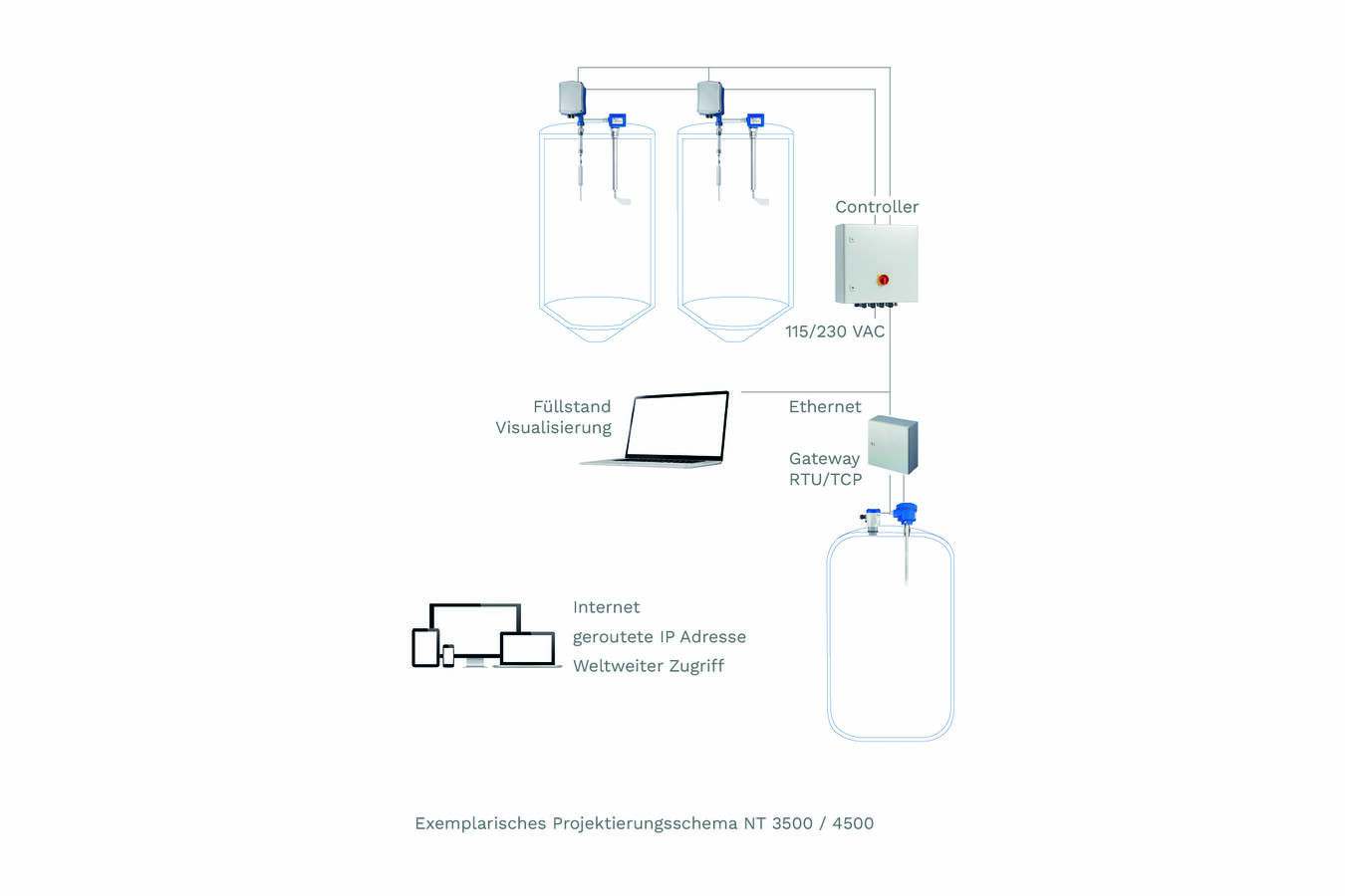 Das NT 3500 System eignet sich optimal zur zuverlässigen Überwachung von Füll- und Grenzständen in Silo-, Tank- und Prozessbehältern. Es ermöglicht die Visualisierung und Disposition der Füllstände über PCs, Laptops, Tablets und Smartphones. Standorte können vernetzt und Schnittstellen zu ERP-Systemen hergestellt werden. Dieses flexible System erlaubt die Integration und Auswertung sowohl alter als auch neuer Anlagen, unabhängig von deren Größe.