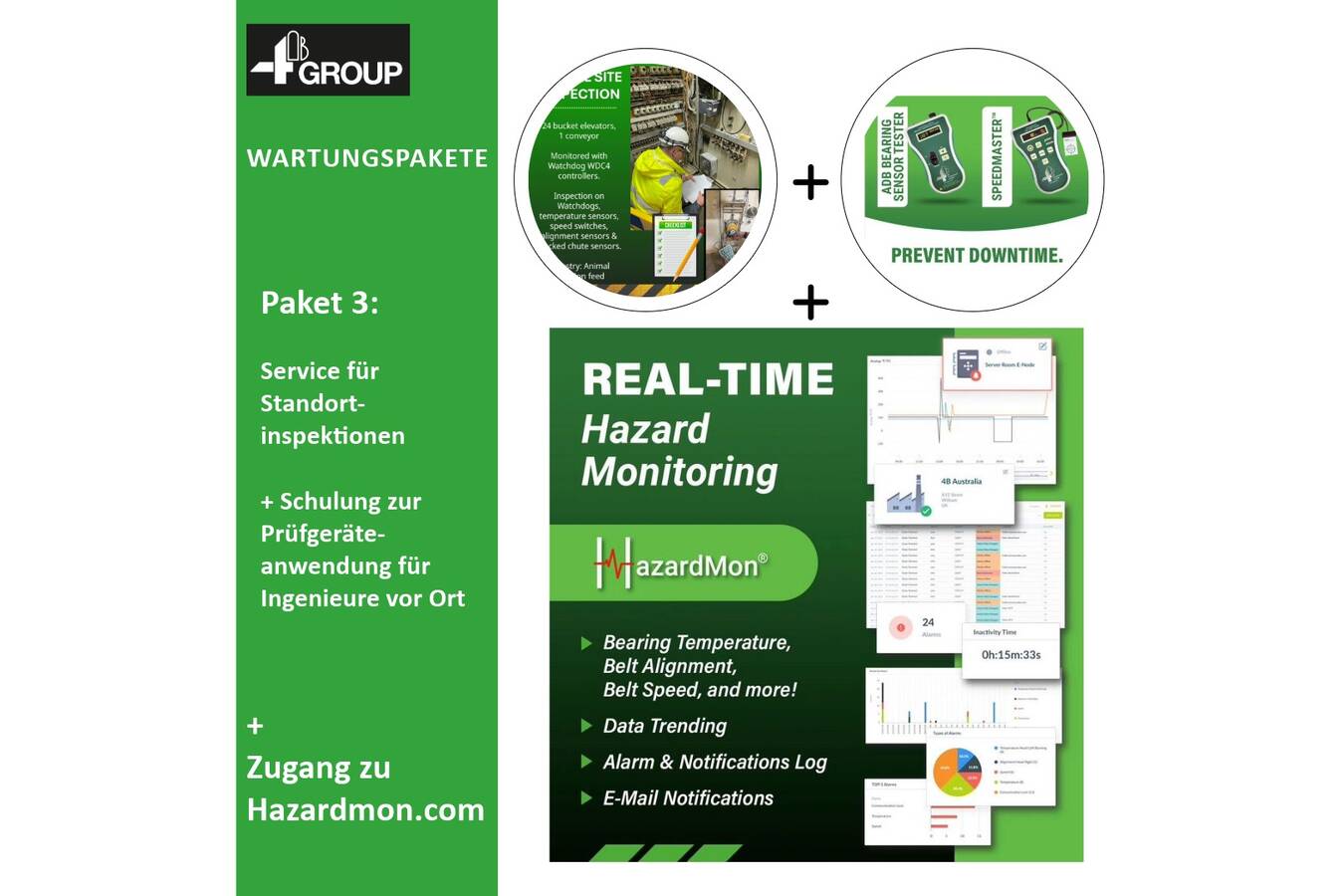 Diese Pakete werden vom technischen Team der 4B Group bereitgestellt und umfassen Standortinspektionen, Schulungen für Ingenieure zur Nutzung von Prüf- und Testgeräten sowie den Zugang zu Hazardmon.com für die Fernüberwachung von Gefahren. Gemeinsam unterstützen diese Leistungen eine proaktive Instandhaltung, die frühzeitige Erkennung von Risiken und eine verbesserte Betriebseffizienz.
