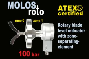Der Drehflügel-Füllstandanzeiger mit Zonentrennelement MOLOSroto DF23A3 … ZTP7 überwacht den Füllstand von Schüttgütern auch bei extremsten Prozessbedingungen. Dieses Gerät wird in einer Absetzgrube einer Gaspipeline eingesetzt. Dort herrscht ATEX Zone 0, die gefährlichste explosionsfähige Atmosphäre als Gemisch aus Luft und brennbaren Gasen. Darüber hinaus muss das Gerät auch noch einem Druck bis 100 bar widerstehen können.