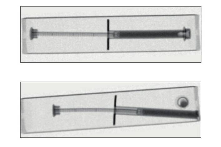 Ein weiteres Anwendungsgebiet für moderne Röntgeninspektionssysteme ist die Erkennung von Kunststoffen. Es ist durchaus bekannt, dass Röntgensysteme nicht alle Kunststoffe als Fremdstoffe erkennen können. Viele Medizinprodukte und Arzneimittel werden jedoch verpackt bzw. aus Kunststoffbehältern dosiert. Abbildung 3 zeigt eine Fertigspritze mit korrekter Länge in einem Karton, und eine andere die eingedrückt wurde. Mit Röntgentechnik kann die Länge der Spritze gemessen werden und eine mögliche Drehung oder Schrägstellung zur besseren Genauigkeit erkannt werden. Spritzen mit falscher Länge können aussortiert werden. Da eine falsche Länge eine Abweichung von der korrekten Dosis bedeutet, wird mit einem Röntgensystem die Produktintegrität sichergestellt, wozu kein anderes System in der Lage Viele Produkte können chaotisch vorgelegt werden oder kombiniert sein und innerhalb einer Verpackung wahllos zusammengefügt werden. Bei einem Röntgensystem kann die beste Erkennungsleistung erreicht werden, wenn man produktspezifische Einstellungen verwendet. Es können zwar verschiedene Produkte mit einer einzigen Einstellung untersucht werden, eine solche Einstellung ist jedoch oft nur ein Kompromiss, der bei einem Produkt zu einer schlechteren Erkennungsleistung führt oder zu einer höheren Rate von Fehlausscheidungen. Ein mit neuester Softwaretechnik ausgestattetes Röntgensystem kann chaotisch angeordnete oder mehrere unterschiedliche Produkte beim Durchlaufen der Röntgenstrahlen automatisch erkennen. Abbildung 4 zeigt Hähnchenkeulen und –schenkel, die typischerweise auf einer Verpackungslinie wahllos verpackt werden. Die Software zeigt die erkannten Produkte auf dem Bildschirm an.