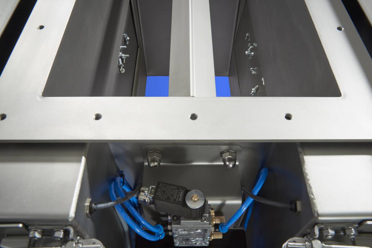 An der Außenseite des völlig glatten Gehäuses sind zwei leistungsstarke Fangmagnete angebracht, die je nach Ausführung grobe oder sehr feine Eisenpartikel aus verschiedenen Materialströmen abscheiden. Der äußere Kernmagnet ist mit Neodym-Eisen-Bor-Magneten (NdFeB) für den Einbau in Freifallstrecken ausgestattet. Ein Vorteil dieser Außenkern-Baugruppe ist, dass es im Inneren zu keiner Brückenbildung oder Verstopfung des Materials kommen kann. Da der Ventilkasten vollständig in die Konstruktion integriert ist, bleibt die Einbauhöhe begrenzt.