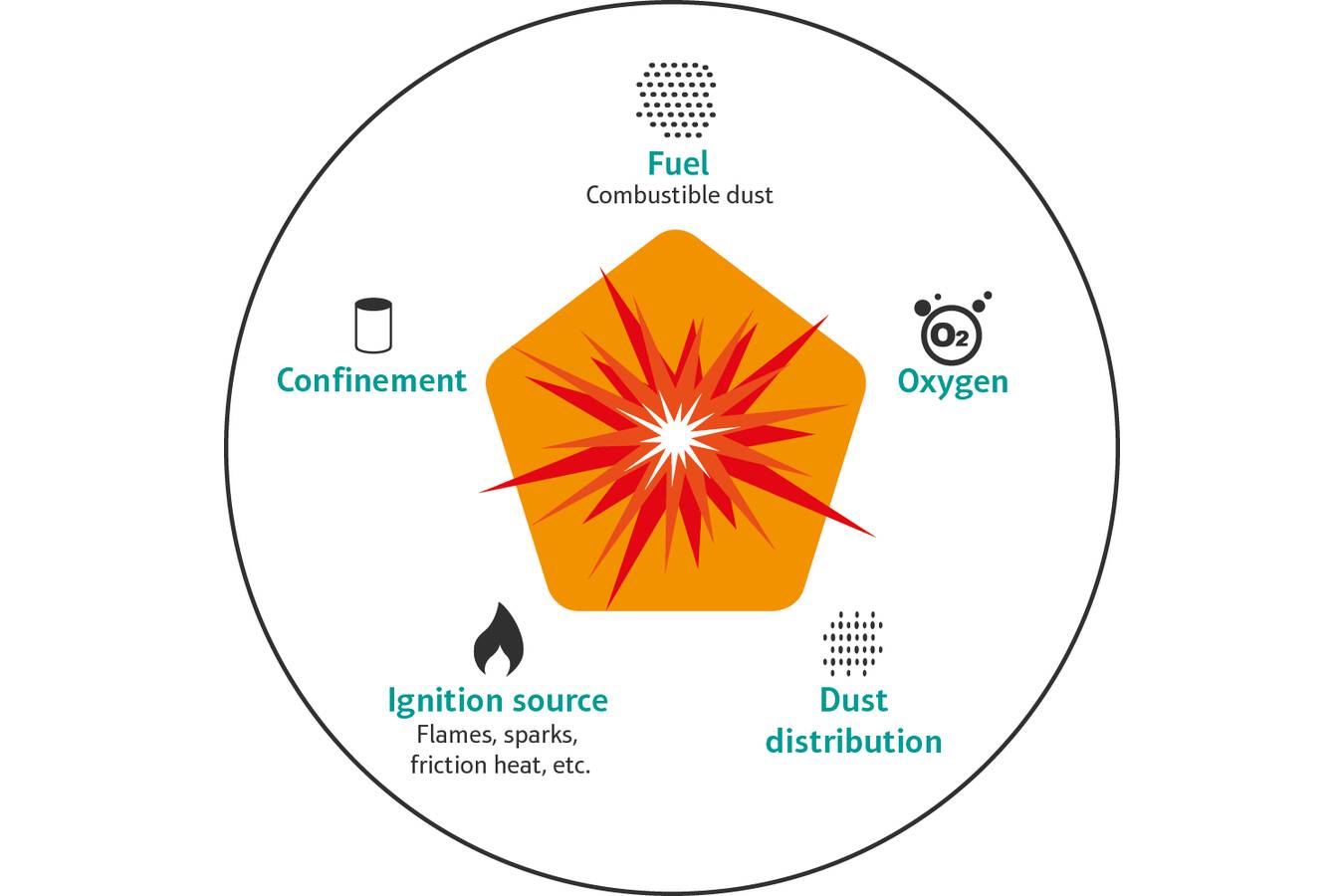 Um das Explosionsrisiko bei der Handhabung brennbarer Feststoffen und Stäube zu minimieren, werden im Folgenden die jeweiligen Staub-Charakteristiken beschrieben. Grundsätzlich wird hierbei das sogenannte Zünddreieck oder auch Zündfünfeck betrachtet.