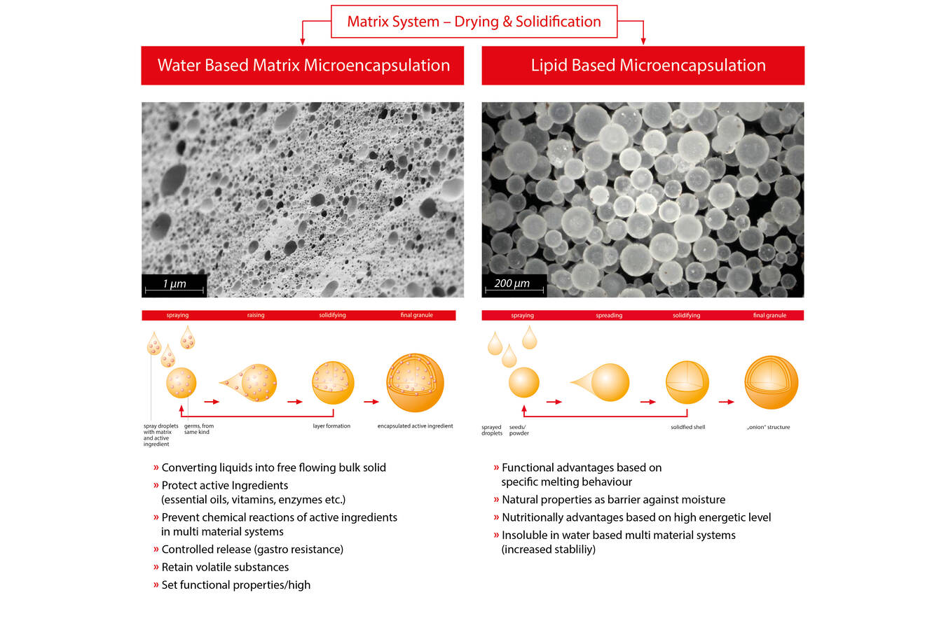 Ätherische Öle sind leicht flüchtige und oxidations- oder lichtempfindliche Stoffsysteme, die ihre Eigenschaften im direkten Kontakt zur Umgebung verändern oder gar verlieren können. Bis heute haben sich vielfältige Anwendungsgebiete und Einsatzmöglichkeiten dieser sekundären Pflanzenstoffe herausgestellt. In der Lebensmittelindustrie werden diese geruchs- und geschmacksintensiven Stoffgemische unter anderem zur Verbesserung sensorischer oder funktioneller Produkteigenschaften eingesetzt, zum Beispiel als natürliches Aroma oder Antioxidans zur Verlängerung der Haltbarkeit. Überwiegend werden ätherische Öle verkapselt oder als freifließende Pulver angeboten: sowohl um sie zu schützen, als auch um sie besser handhaben und dosieren zu können. Prinzipiell eignen sich diese Produktformen für die Beimischung in allen festen Formulierungen, die als Pulvermischung vorliegen. Ein wichtiges physikalisches Verkapselungsverfahren ist die Mikroverkapselung durch kontinuierliche Sprühgranulation in der Strahlschicht. Dabei dient eine matrixhaltige Öl-in-Wasser-Emulsion als Ausgangsstoff, das Resultat sind Feststoffpartikel mit optimaler Verteilung des eingeschlossenen Öls und definierter Partikelgröße.